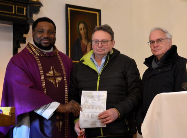 Pfr. Mag. Francis Abanobi bedankte sich mit herzlichen Worten für seinen wertvollen Dienst und betonte, dass die ehrenamtlichen Arbeiten für eine Pfarre unersetzlich sind. Er und Norbert Pointecker überreichten Walter eine Ehrenurkunde und ein Geschenk.