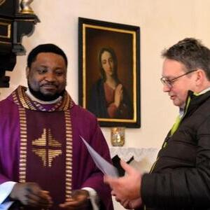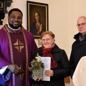 Es gab noch eine weitere Ehrung an diesem Abend. Frau Maria Niederhauser, die Ehefrau von unserem Totengräber Alois Niederhauser wurde für ihre 30-jährige Mithilfe beim Totengraben geehrt. Das ist eine körperlich und psychisch sehr belastende Arbeit – Winter wie Sommer - die in dieser Art und Weise kaum noch jemand ausführen mag und kann. Dafür bedankte sich Pfarrer Francis ganz herzlich mit einer Ehrenurkunde und Blumen.