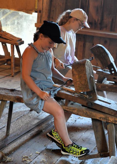Ungefähr alle halbe Stunde wurden die Gruppen gewechselt, sodass jede/r das volle Programm durchmachen konnte. Und das war sehr abwechslungsreich! Auf der „Hoanzlbank“ mit einem „Roafmesser“ einen Stecken abzuschälen und zu spitzen war für alle Kinder eine Herausforderung, die sie im Schweiße ihres Angesichtes bravourös gemeistert haben.