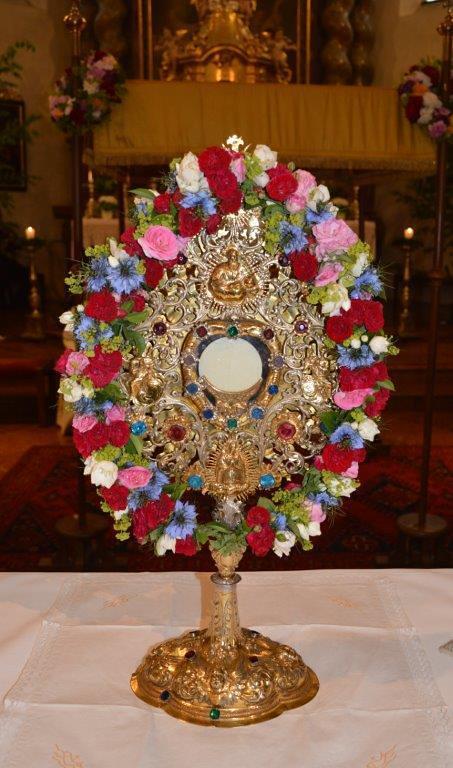 Pfarrer Francis spendete allen Mitfeiernden den Segen mit der schön geschmückten Monstranz und zum Abschluss der Festmesse wurde gemeinsam „Großer Gott wir loben dich“ gesungen.