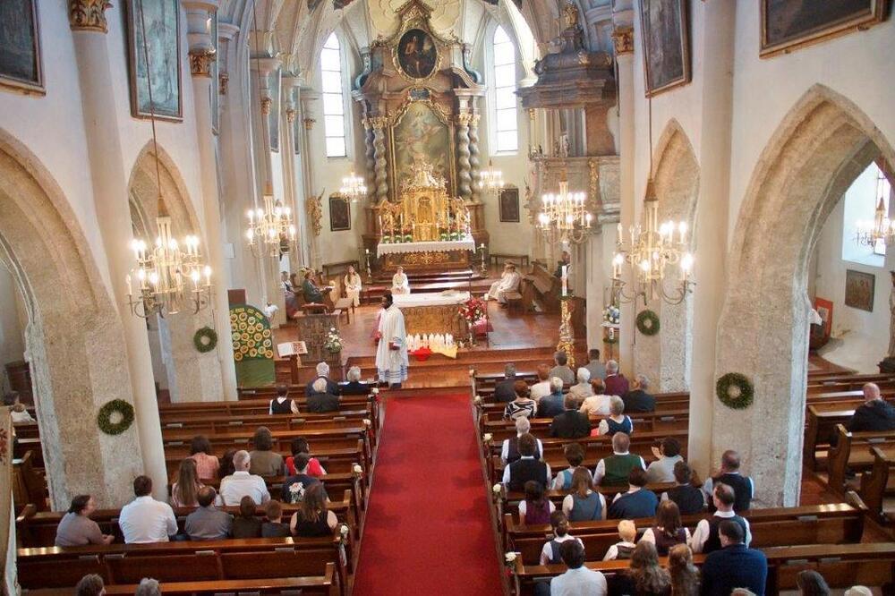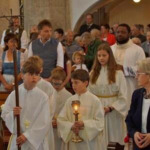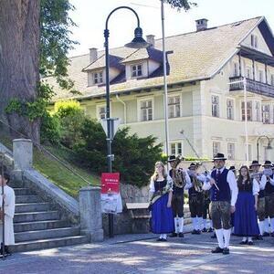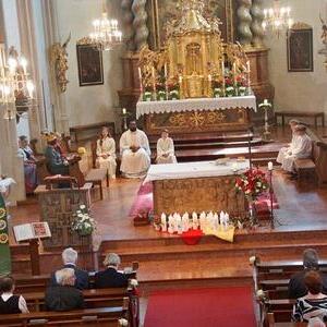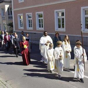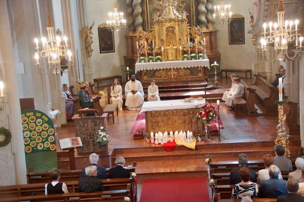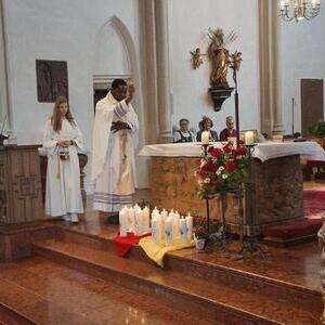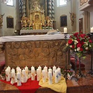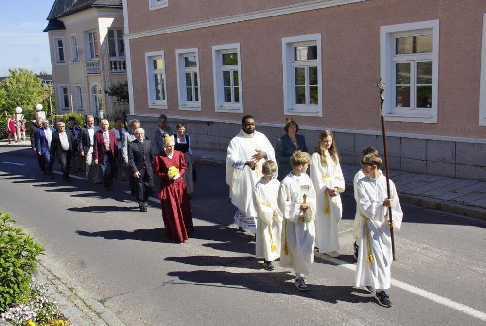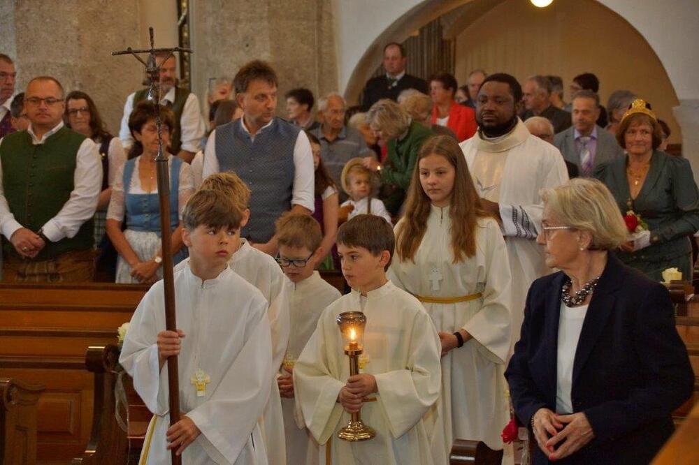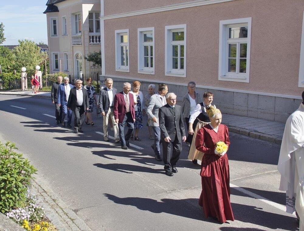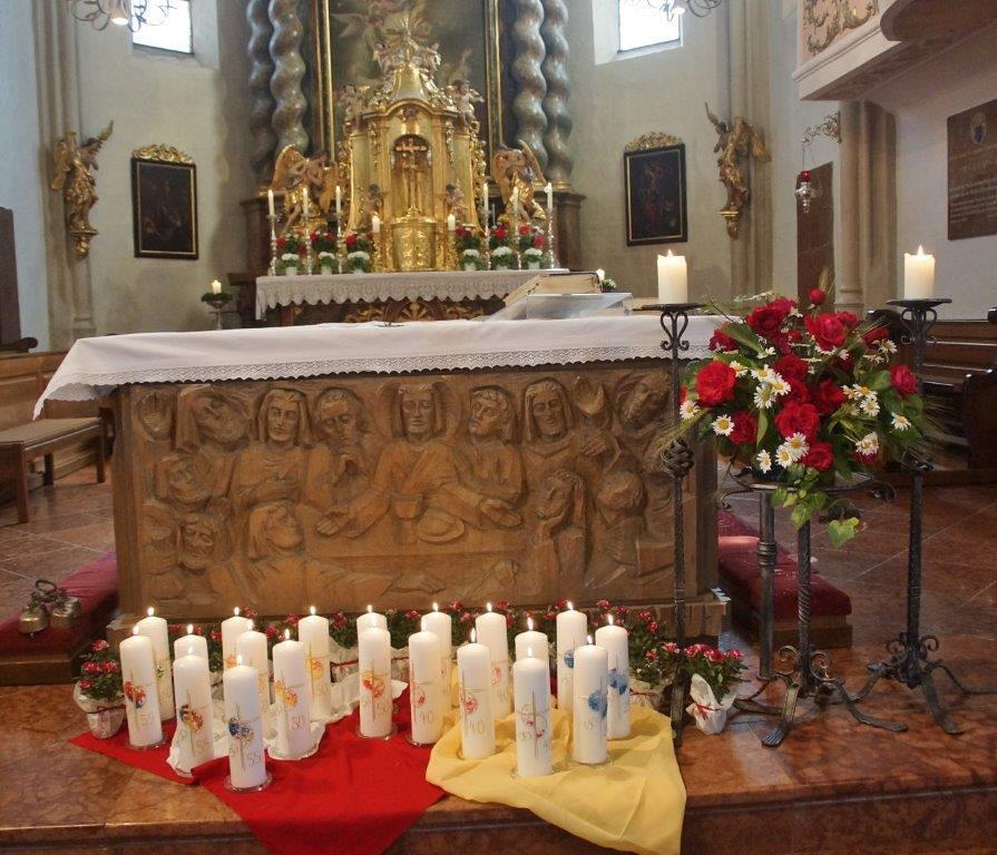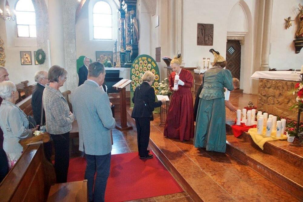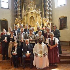 Die Goldhaubenfrauen überreichten die von Pfarrer Francis gesegnetenKerzen und ein kleines Rosenstöckerl, die Solinger verschönten beim Einzug und in der Kirche dieses Fest.