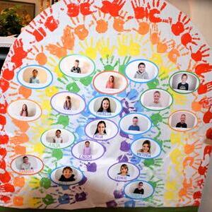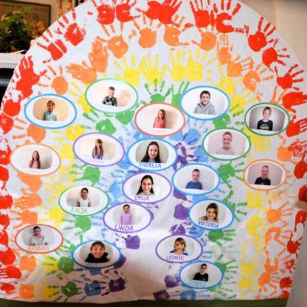 Das große Plakat mit den Händen in Regenbogenfarben und mit den Fotos der Kinder wies bereits auf das Thema der heurigen Erstkommunion hin: „Singen unterm Regenbogen – Gott ist immer für mich da!“ Auch das Kyrie und die Fürbitten bezogen sich auf den Regenbogen, sowie die bunten Kerzen und Tücher auf dem Altar.