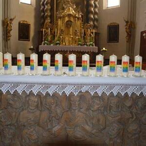 Mit einem festlichen Gottesdienst im „Symbol des Regenbogens“ feierten am Pfingstmontag, 09. Juni 2025, achtzehn Ehepaare der Pfarre Aspach ihr 25-,40-, 50-, 55-, 60- und 65-jähriges Ehejubiläum. Die Goldhaubenfrauen, die auch die Festmesse mitgestalteten, überreichten den Jubelpaaren die von Pfarrer Francis gesegneten Kerzen. Die Solinger beim Einzug in die Pfarrkirche und die Chorgemeinschaft im Rahmen des Gottesdienstes verschönerten dieses Jubelfest; ein herzliches Danke für die musikalischen Darbietungen.