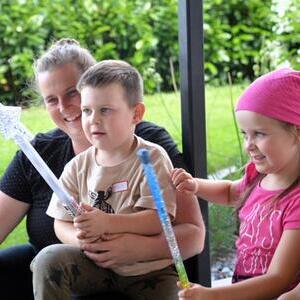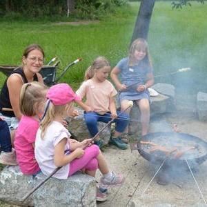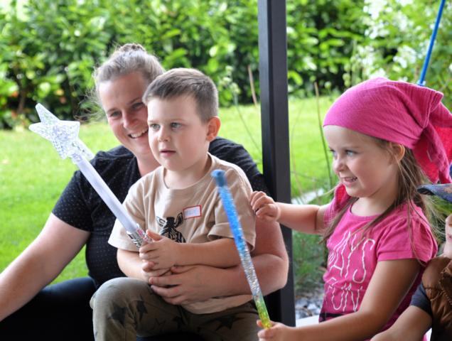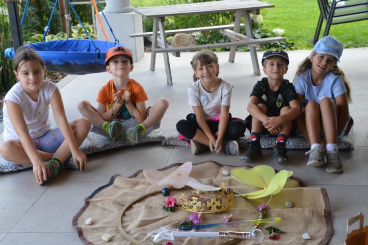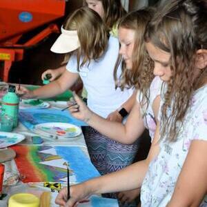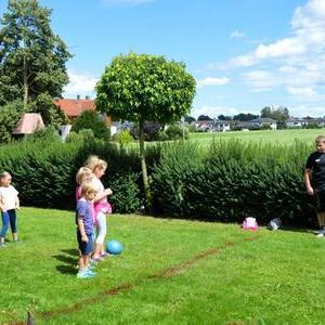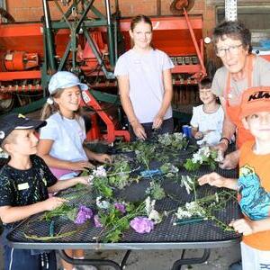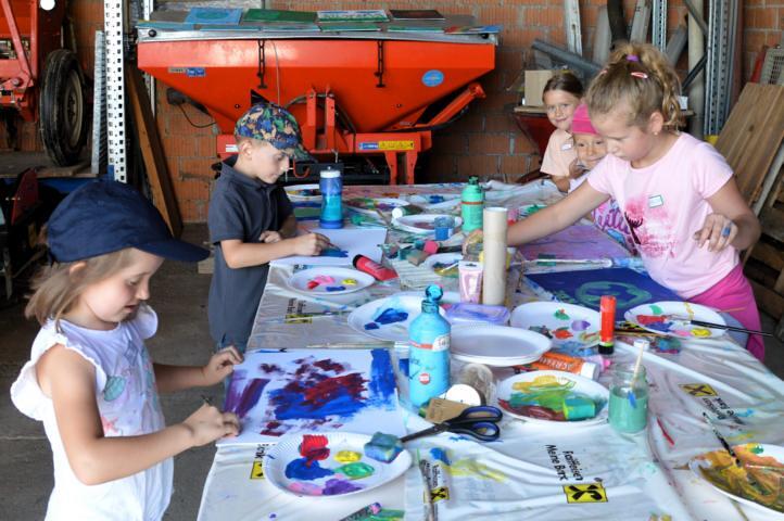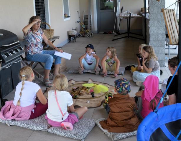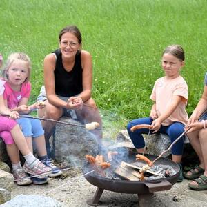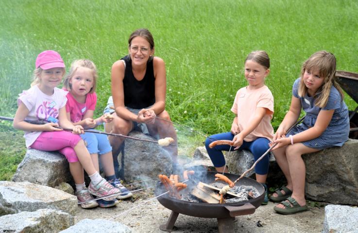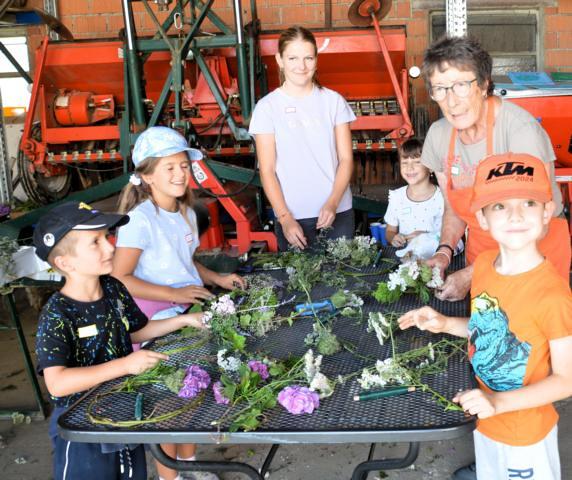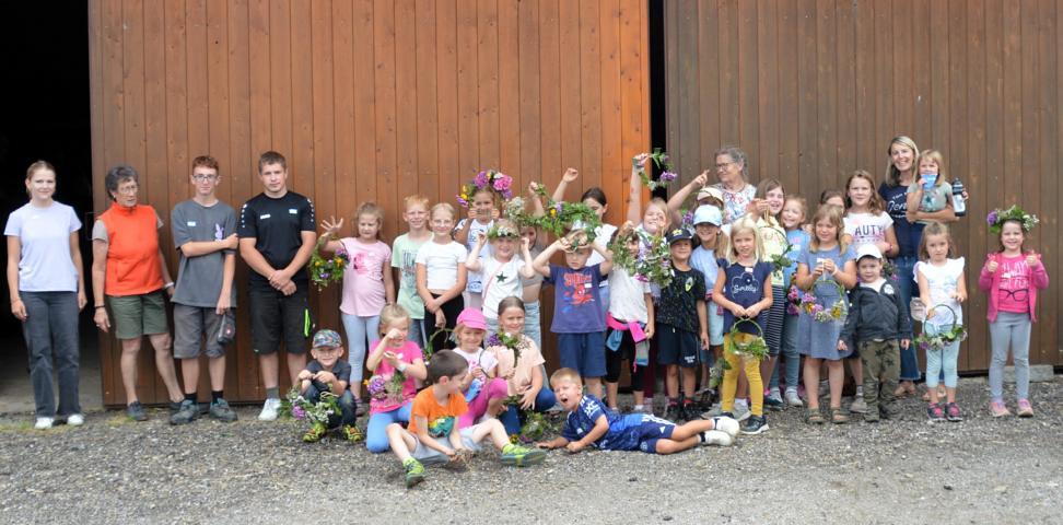 30 Kinder zwischen 6 und 10 Jahren waren zur Familie Kaufmann, vulgo Deubler in Eisecking gebracht worden, um den Nachmittag mit „Blütenzauber für kleine Entdecker“ zu verbringen. Aufgeteilt auf vier Gruppen/Stationen (Blumenkranz binden, Bild mit Acrylfarben malen, Märchen erzählen, Ballspiele) waren die Kinder eifrig bei der Sache und der Nachmittag ging im Nu vorüber. Als krönenden Abschluss und Stärkung gab es gegrillte Würstl mit Stockbrot von der Feuerstelle.
