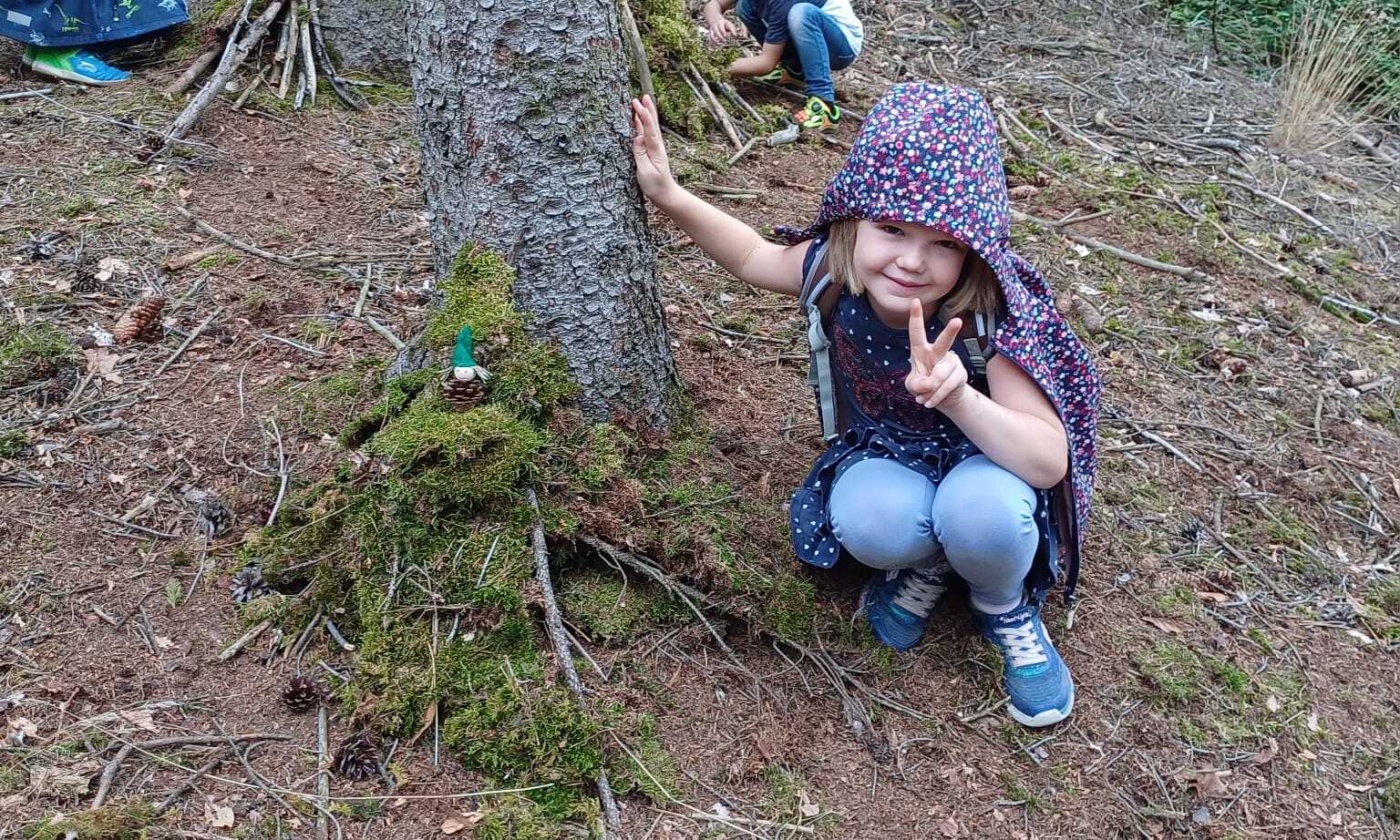 Auf einer Lichtung bekamen die Kinder die Aufgabe, Wichtel zu suchen. Hernach sollten die Kinder den Wichteln ein Häuschen aus Moos, Stäben und Zapfen, etc. bauen. Das war eine grandiose Idee! Die Kinder suchten in Kleingruppen das nötige Material und den richtigen „Baugrund“, damit sie richtig loslegen konnten. Dabei entstanden Straßen, Zelte, Häuschen mit Anbau u.v.m. Der Phantasie waren keine Grenzen gesetzt und der Zeit anscheinend auch nicht. Denn als wir zur Jause beim Adlersberger Kreuz aufbrechen wollten, hatten viele gar nicht Zeit dazu. Aber dafür durften die Wichtel mit den Kindern mitkommen. Schließlich lockte doch die gute Jause, die Anni Schnetzlinger vorbereitet hatte und gestärkt und zufrieden traten wir den Rückweg an.