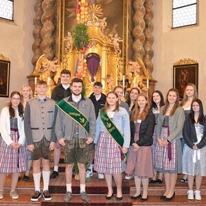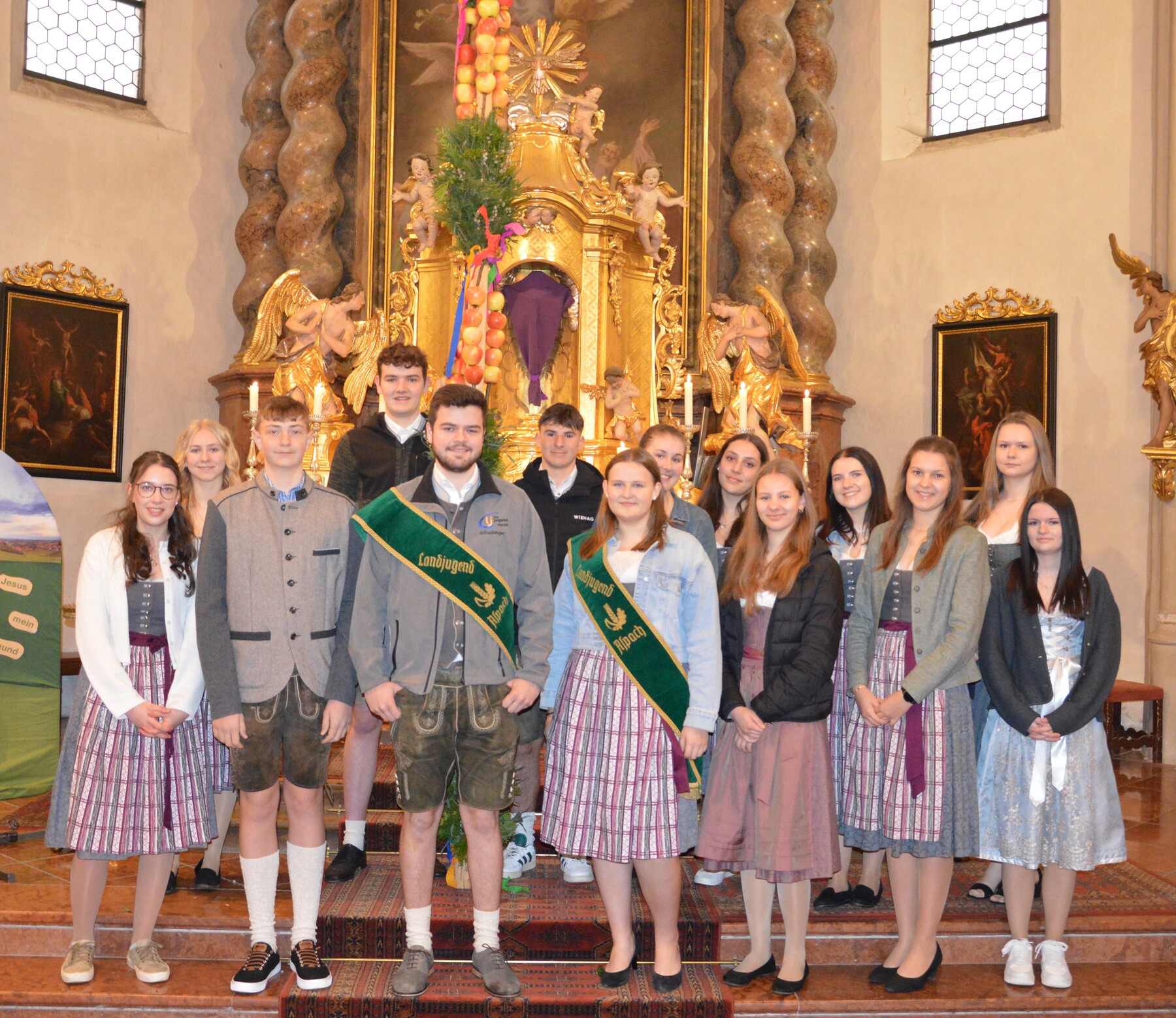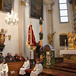 Die Landjugend hatte wieder einen großen Palmbaum gebunden, der mit Palmbuschen und vielen Äpfeln geschmückt war. Nach dem Gottesdienst wurden die geweihten Äpfel und Palmbuschen an die Pfarrbevölkerung verteilt.