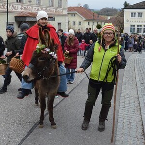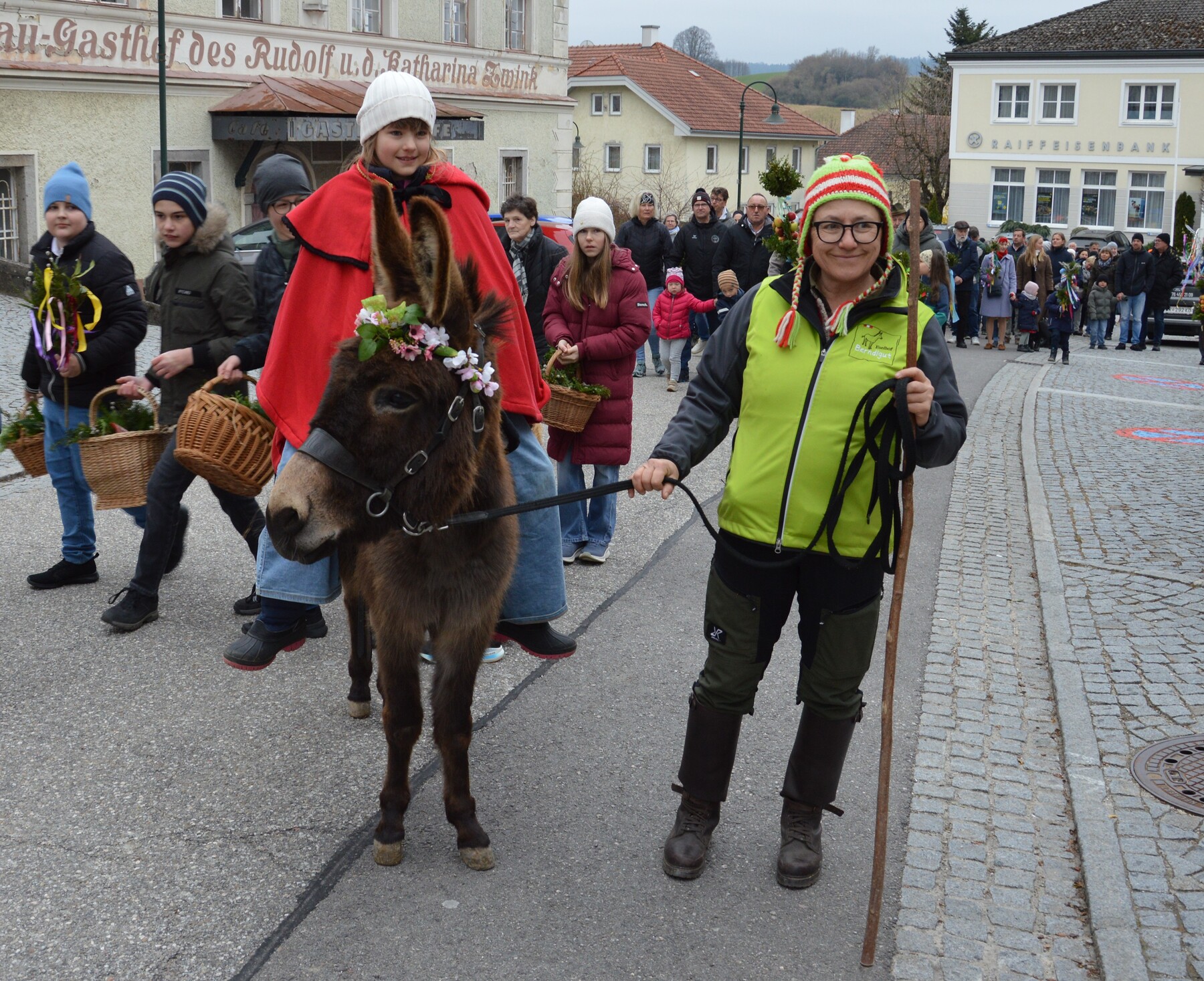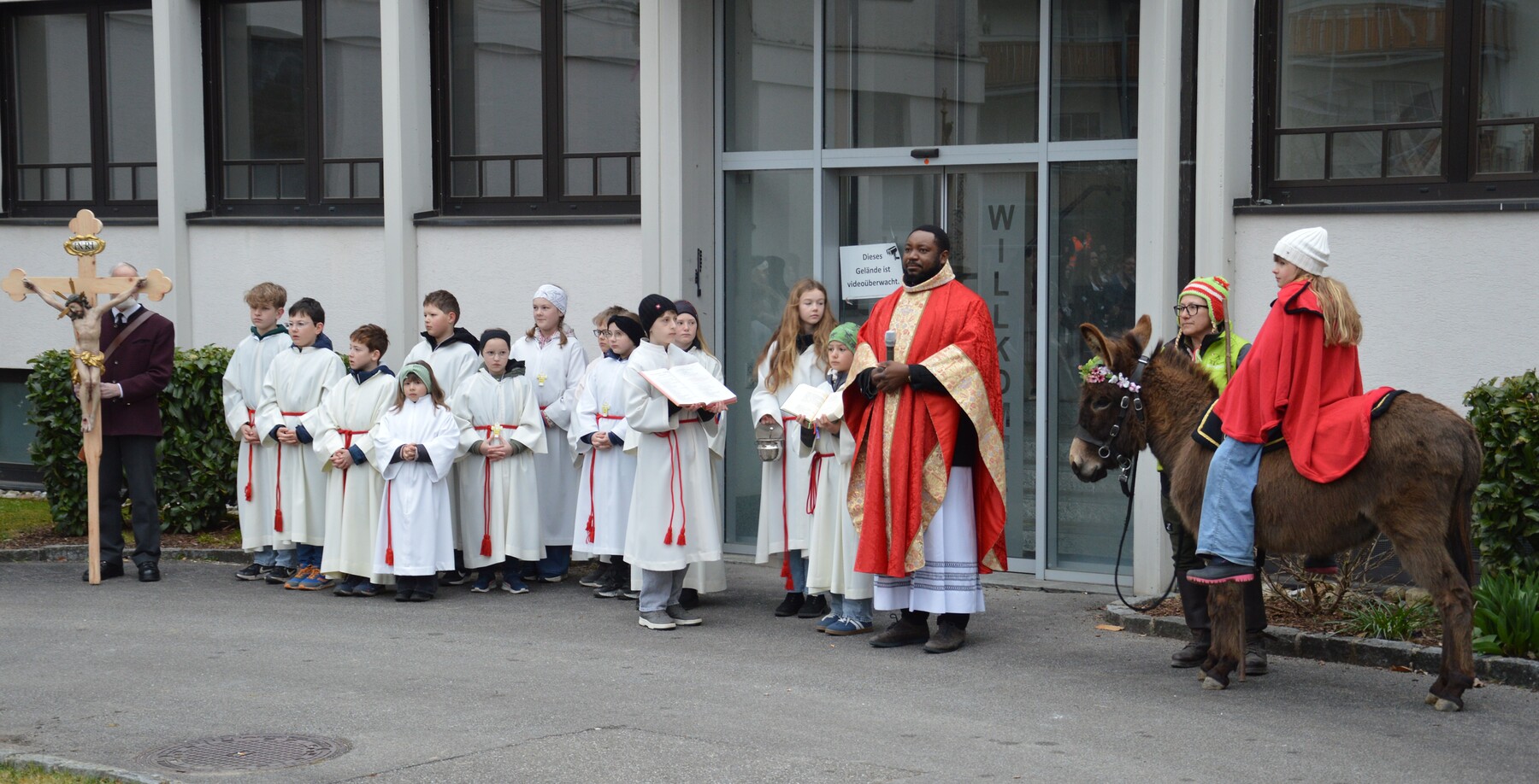 Unsere Palmprozession begleitete heuer erstmals auch ein Esel; Johanna, eine Ministrantin, durfte während der Prozession auf Pinocchio reiten.