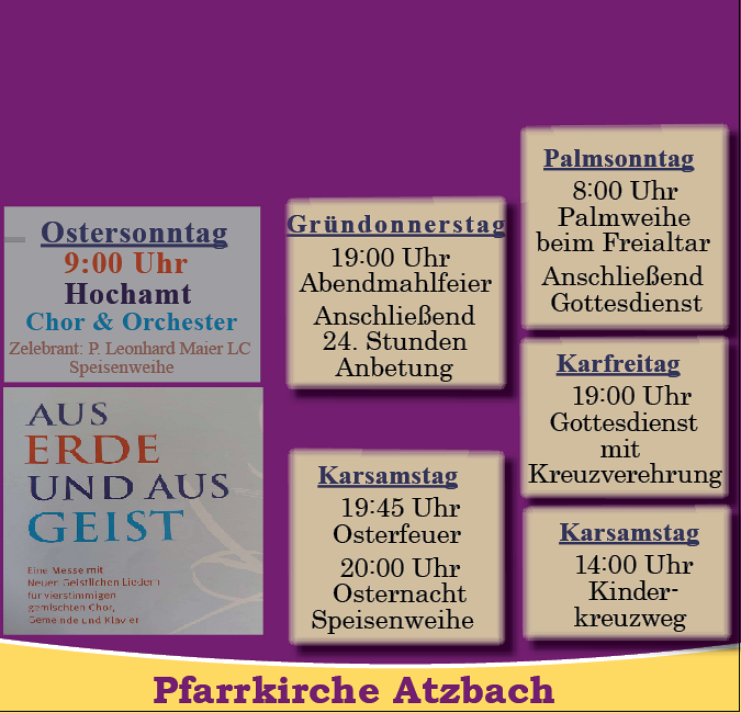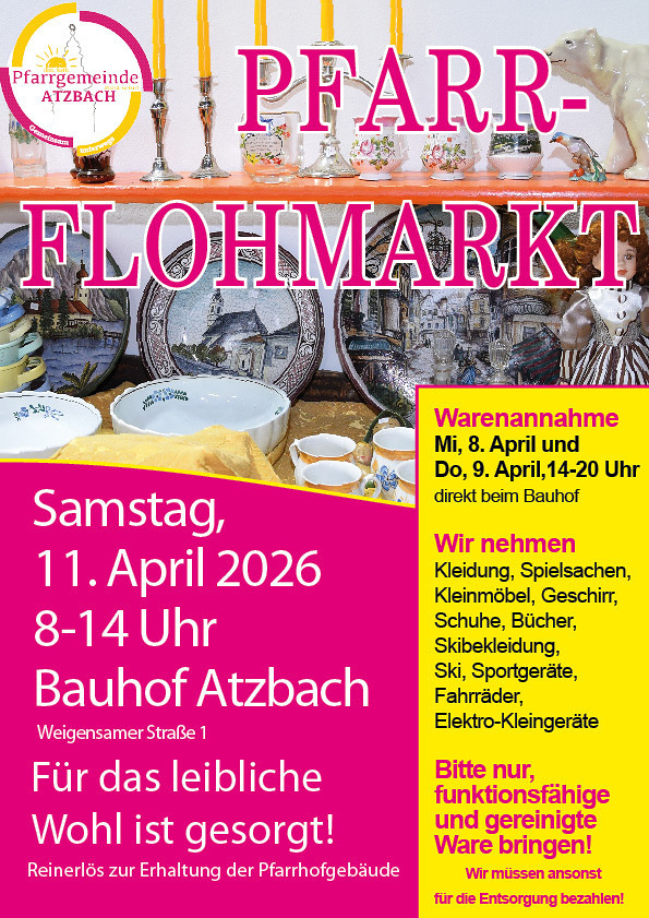 Pfarrflohmarkt am 11. April 2026 Pfarr Flohmarkt Samstag 11. April 2026 im Bauhof Atzbach. Warenannahme: Mi. 8 April u. Do. 9 April 14-20 Uhr Annahme direkt beim Bauhof Wir nehmen: Kleidung, Spielsachen,Kleinmöbel, Geschirr, Schuhe. Bücher, Skibegleidung, Ski, Sportgeräte, Fahrräder, Elektro Kleingeräte. Bitte nur funktionsfähige und Gereinigte Ware bringen. Für das leibliche wohl ist gesorgt mehr: Pfarrflohmarkt am 11. April 2026