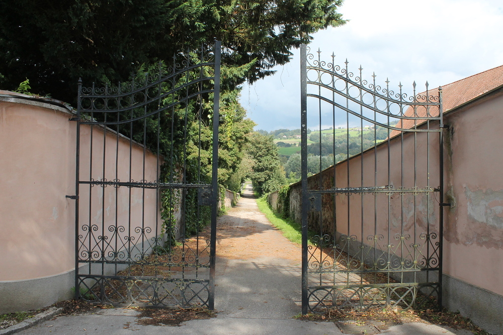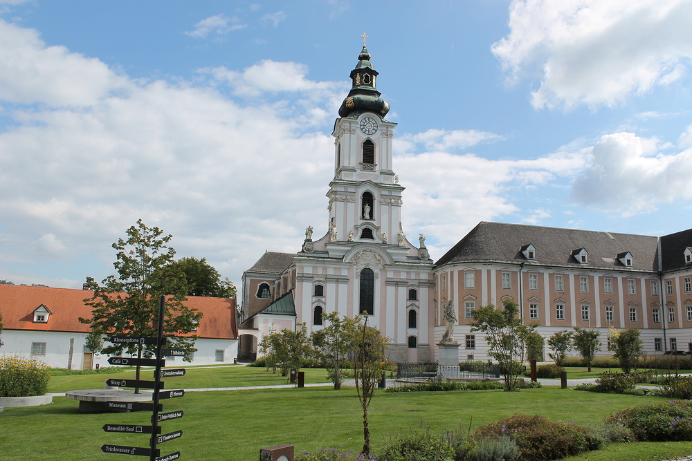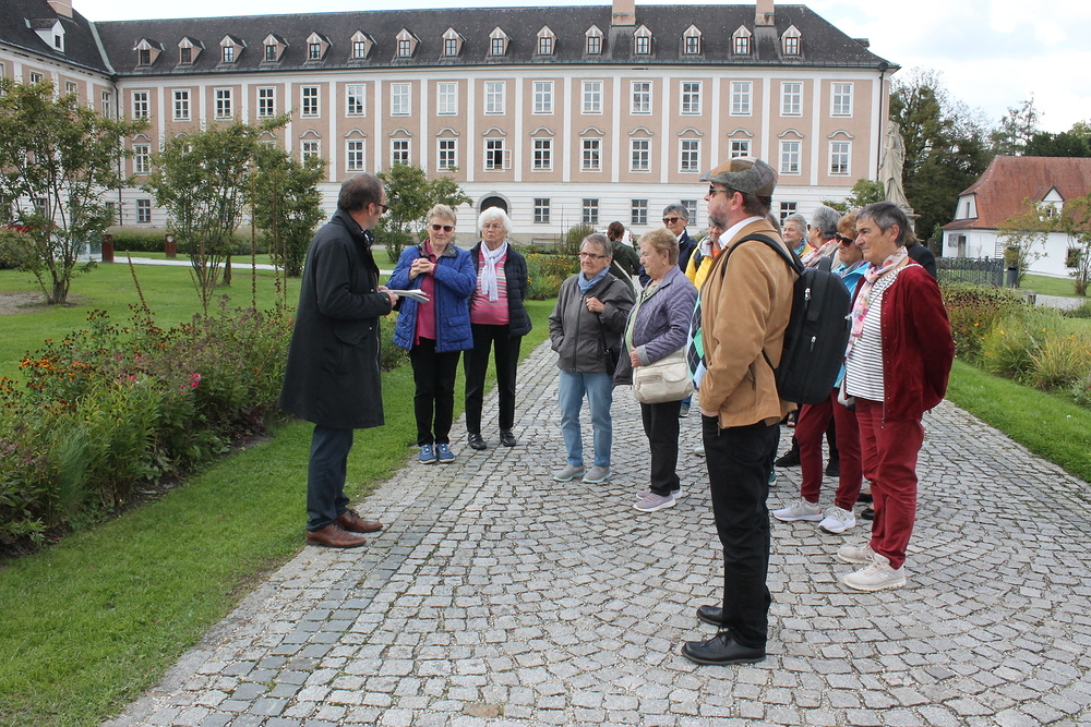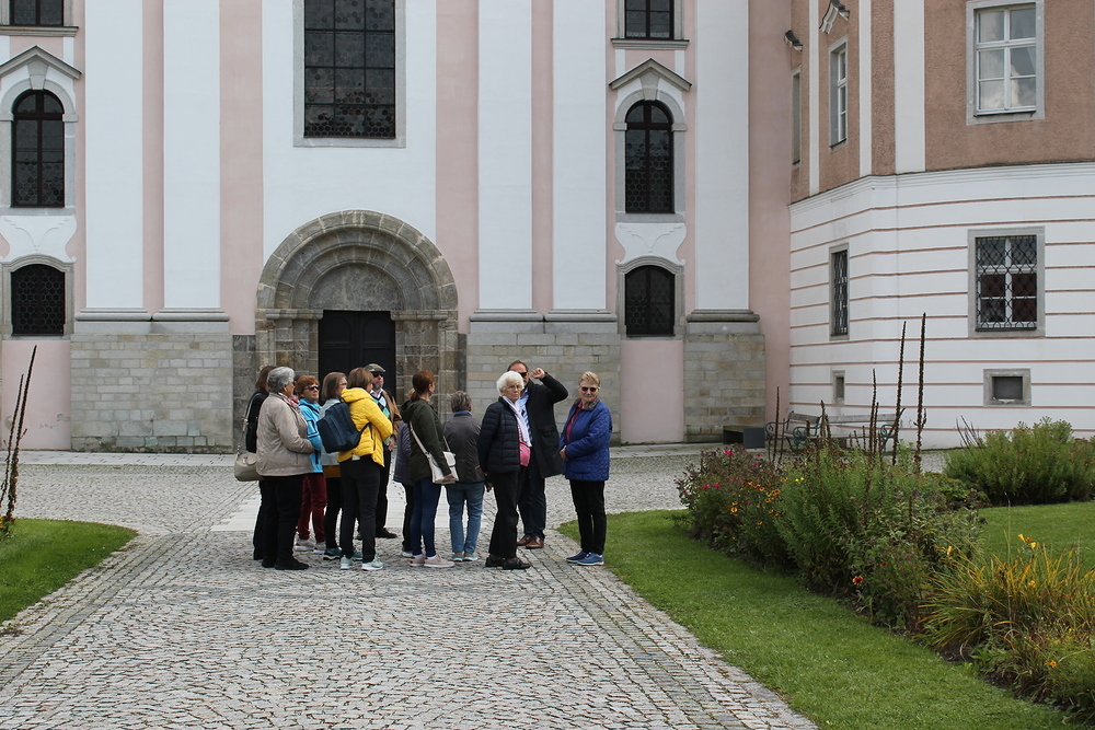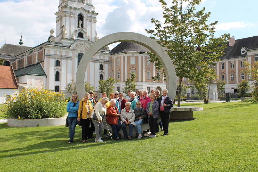 Gut gesättigt ging es dann auch schon weiter zum Stift Wilhering. Bei blauem Himmel und Sonnenschein gehörte ein Gruppenfoto im neu gestalteten Stiftspark einfach dazu.