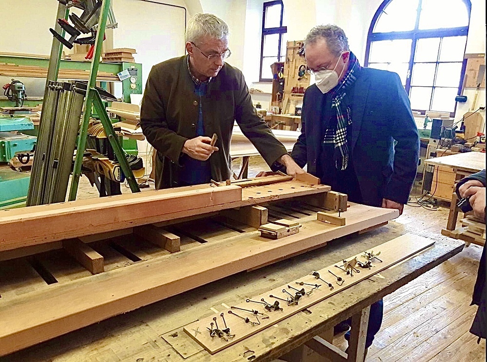 Dieses Foto mit der Windlade der Orgel im Vordergrund auf der Werkbank, entstand beim Besuch von Herrn Dr. Pichler vom Bundesdenkmalamt, in der Orgelbauwerkstätte in St. Florian.