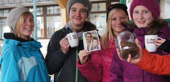Coffee to help-Aktionen: Kaffeetrinken hilft Menschen in Not (komplette Box für 10 Personen kann ausgeborgt werden, um Projekte für Menschen in Not zu unterstützen, z.B.: eine Ziege für Burundi - Schenken mit Sinn)