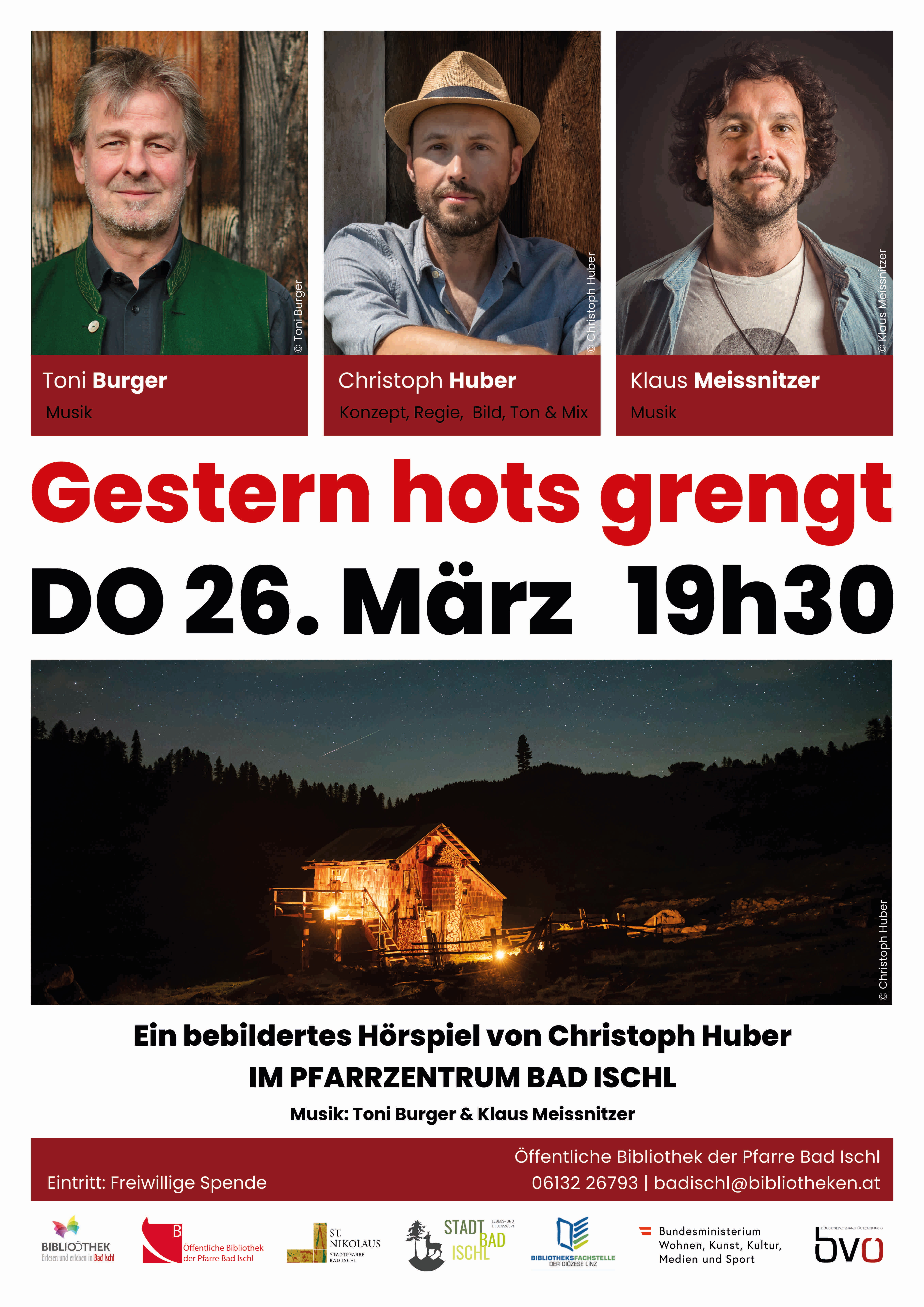 Seit 15 Jahren verbringt der Fotograf Christoph Huber die Sommer als Hirte der Königreichalm am Dachsteinplateau. Diese Umgebung, die Region rund um den Dachstein hat ihn zu einem berührenden und fein bebilderten Hörspiel inspiriert. Im Stück „GESTERN HOTS GRENGT“ verarbeitet Christoph Huber originale Hüttenbucheinträge der Alm zu einer Erzählung über Veränderung und Beständigkeit, über zutiefst menschliche Empfindungen und Erfahrungen, über das Leben und Sterben auf der Alm in Anbetracht einer herannahenden globalen Klimakrise.