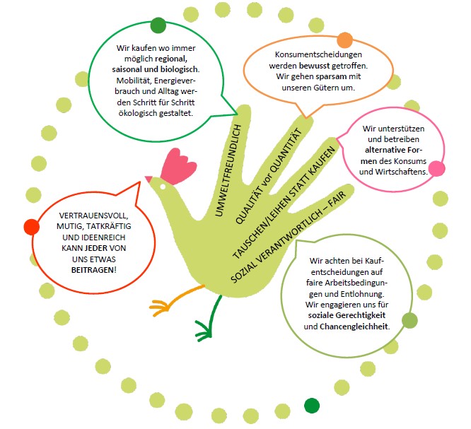 Bei der Gestaltung des Pfarrlebens und der Entscheidung über die Anschaffung bestimmter Produkte sind für uns Fragen der Qualität und Wirtschaftlichkeit von Bedeutung. Das zentrale Entscheidungskriterium für den Einkauf und Lebensstil in unserer Pfarre ist die Beachtung grundlegender Menschen- und Arbeitsrechte sowie Umweltstandards. Wir haben uns für einen verantwortungsvollen Umgang mit den begrenzten Ressourcen und damit für die Bewahrung der Schöpfung und für mehr Gerechtigkeit durch fairen Handel entschieden. Dieses Leitbild dient als Grundlage zur Umsetzung einer ökofairen Beschaffung und eines nachhaltigen Lebens in unserer Pfarrgemeinde.