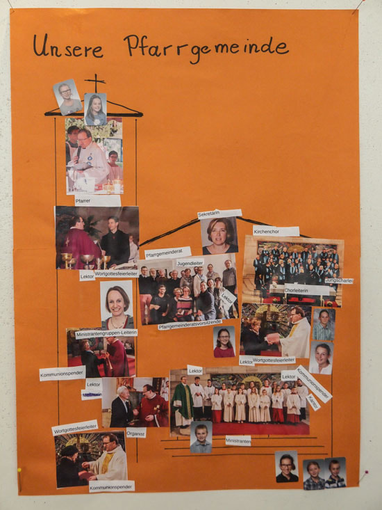 Auf die Umrisse unserer Pfarrkirche klebten die Ministranten anschließend Personen, die wichtige Aufgaben in der Pfarre haben. Die Kinder und Jugendlichen fanden es spannend, dass es einige Leute gibt, die „richtig viele“ Aufgaben haben. Mit großer Freude suchten die Kinder dann Plätze in der Kirche, wo ihr Pickerl gut hinpasst. Wir Ministranten sind ein wichtiger Teil der Kirche. Aber selbstverständlich gehören noch sehr viele Personen zu unsere Kirche, die wir nicht aufkleben konnten.