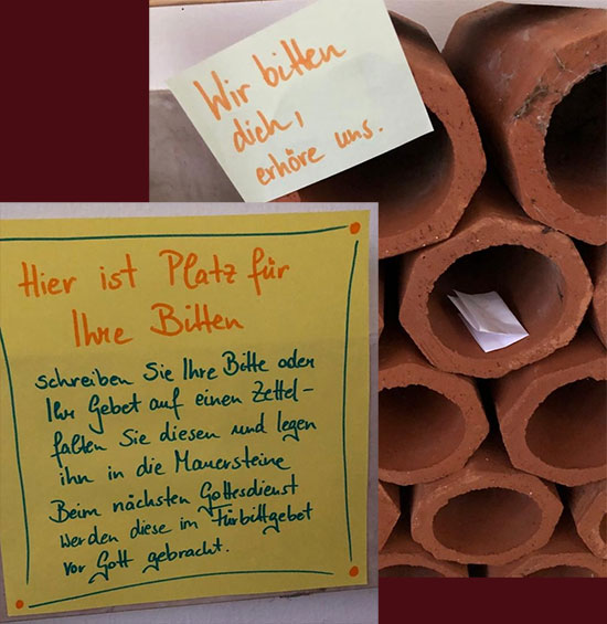 Die Katholische Jugend hat in der Kirche eine Fürbittmauer aufgebaut. Hier finden Sie Platz für Ihre Bitten oder Gebete, die Sie auf einem Zettel formulieren und in einen Mauerstein legen können. Beim nächsten Gottesdienst werden diese im Fürbittgebet vor Gott gebracht.