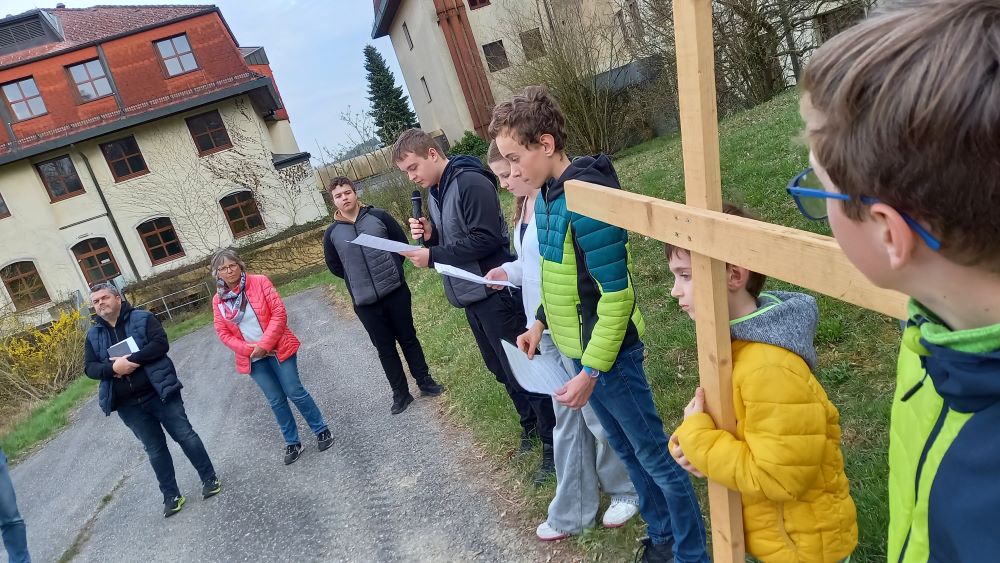 Die Jugendlichen der Firmgruppe trugen das Kreuz auf den Berg. Sie gestalteten auch die erste Station mit Musik und Texten.