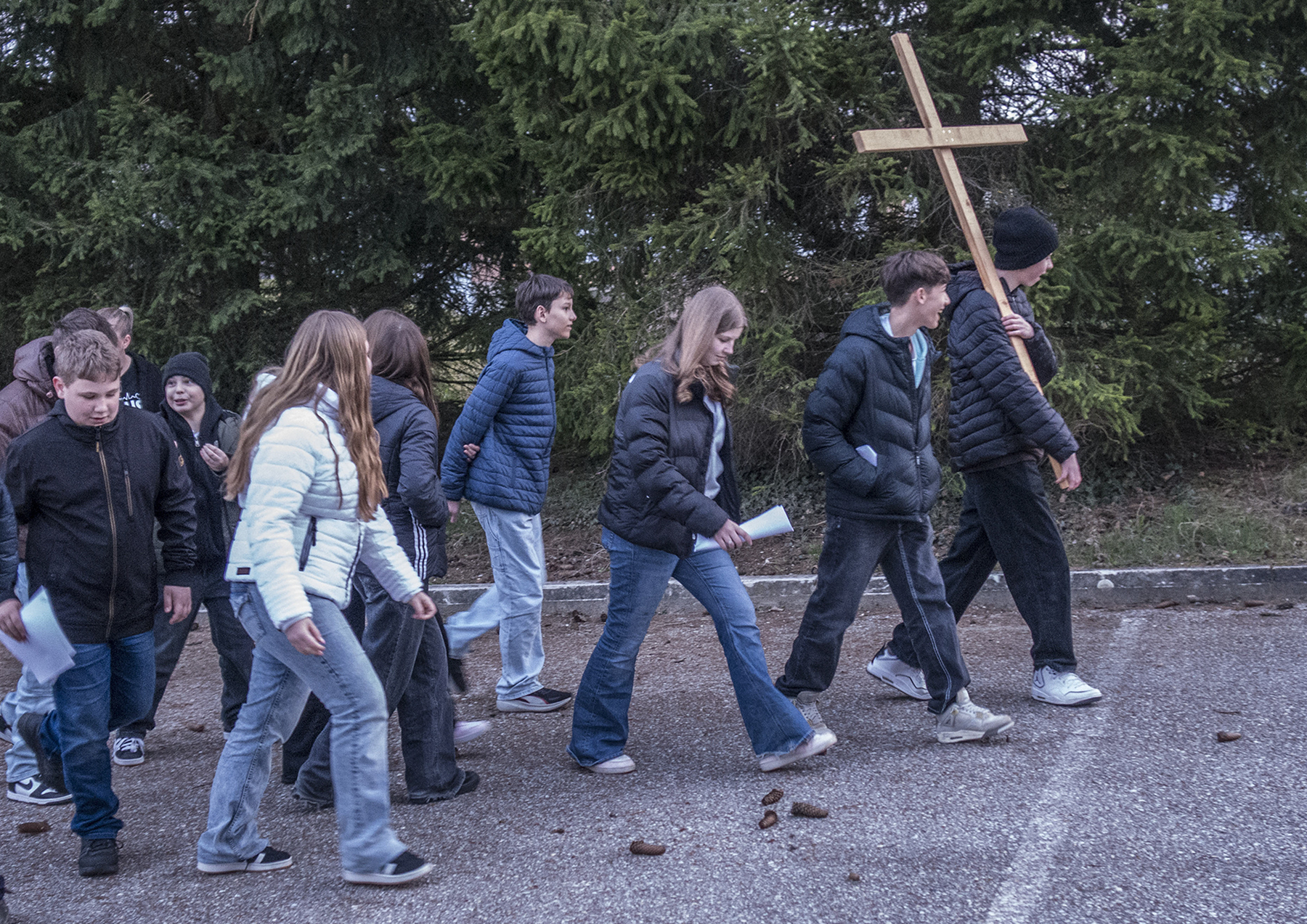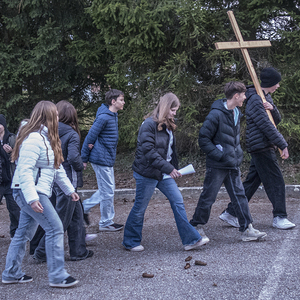 Die Teilnehmenden gingen gemeinsam betend und singend den Weg hinauf, angeführt von motivierten Firmlingen, die das Kreuz trugen.