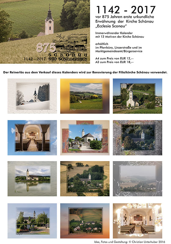 Der Kalender besteht aus 12 Motiven der Schönauer Kirche und kann im Pfarrbüro und im Marktgemeindeamt zu den jeweiligen Öffnungszeiten erstanden werden.