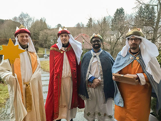 Die vier Dreikönige nach ihrer erfolgreichen Sammelaktion bei stürmischem Regenwetter