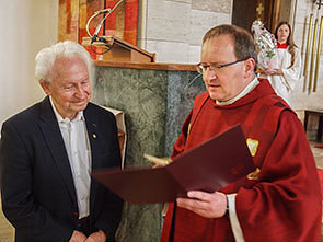Da Rudi Markgraf seit 50 Jahren regelmäßig und mit viel Leidenschaft bei vielen Gottesdiensten die Orgel spielt, wurde ihm am Pfingstsonntag eine diözesane Ehrung und ein kleines Geschenk der Pfarre überreicht.
