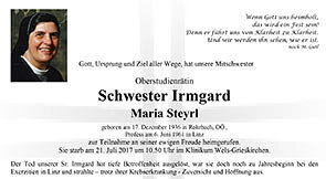 Der Tod unserer Sr. Irmgard hat tiefe Betroffenheit ausgelöst, war sie doch noch zu Jahresbeginn bei den Exerzitien in Linz und strahlte – trotz ihrer Krebserkrankung - Zuversicht und Hoffnung aus.