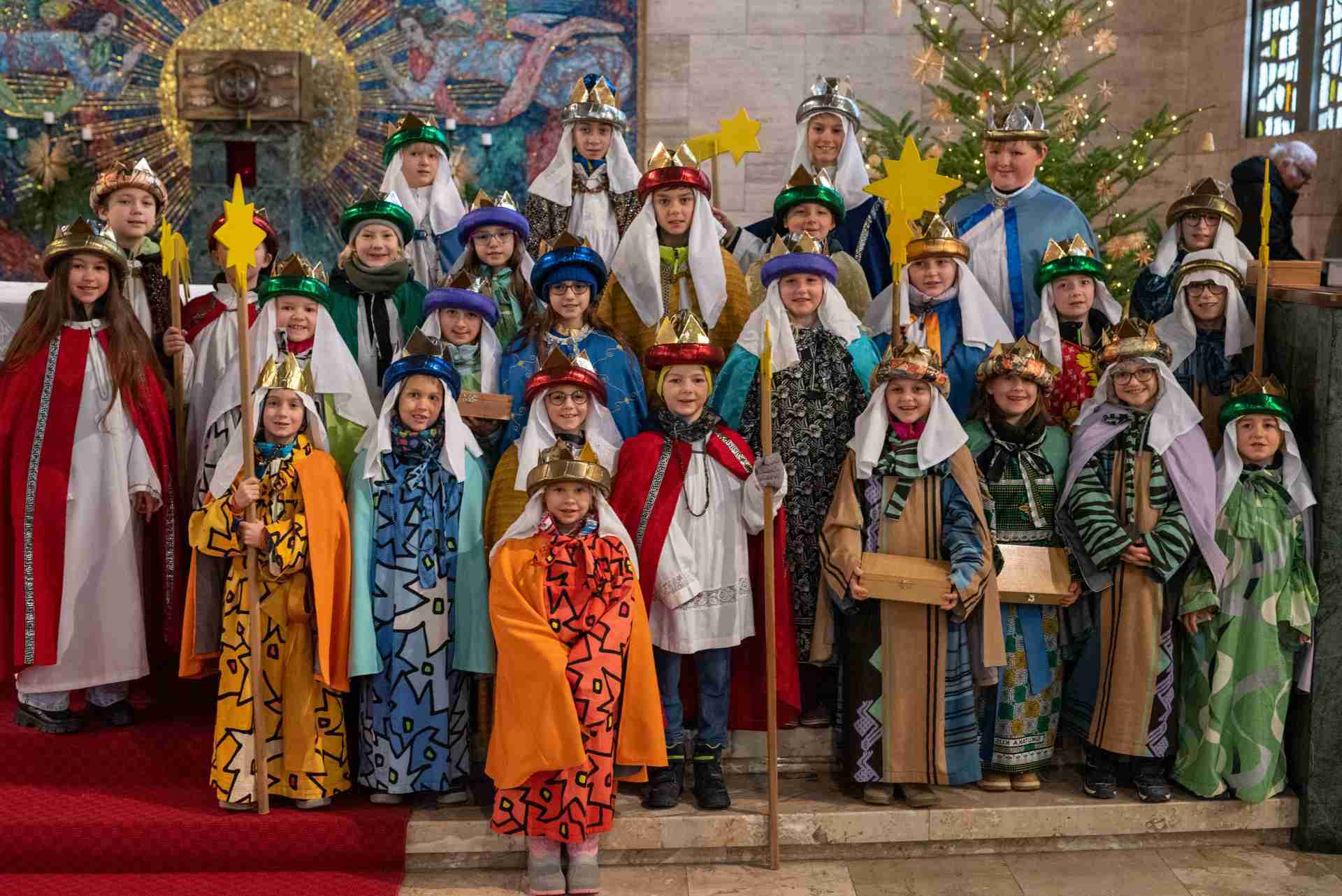 Am 6. Januar 2025 feierten etwa 40 Königinnen und Könige den Sternsingergottesdienst. Unter der Leitung von Angelika Hofer und Christina Sporn trugen sie ihren Sternsinger-Spruch vor, lasen die Kyrie-Worte und brachten ihre Fürbitten vor. Unterstützt von einem Gitarren-Ensemble sangen sie fröhliche Lieder.