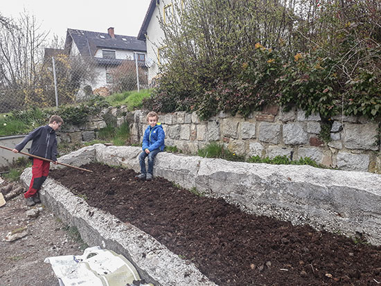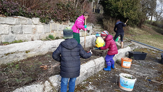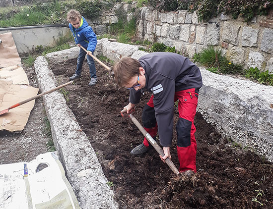 6.3. - Dank Emilia, Heike, Philipp, Max und Samuel unterstützt von den Leiterinnen Katharina (Jungschar) und Martina (Jugend) sind wir heute mit dem Umstechen fertig geworden. Das Beet ist jetzt abgedeckt und die Regenwürmer dürfen die Erde auflockern. Weiter geht's am 28.3.