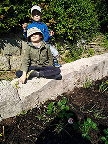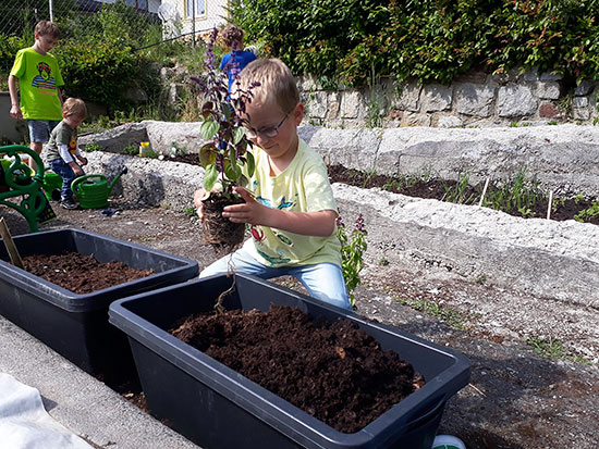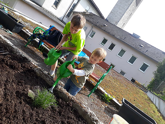 Für die kleinen Geschwister der Ministranten sind die Stauden oberhalb unseres Beets ein spannender Urwald. So hatten die Kindergartenkinder Rafael und Nicolas viel Spaß, als sie sie (ohne Brüder!) Erdbeeren und Kohlrabi pflanzen und gaaanz viel gießen durften.