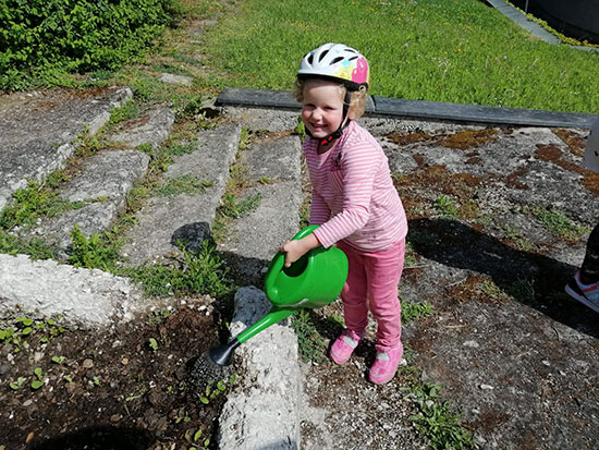 Wir freuen uns auch, dass wir das Werkzeug unseres Pfarrers Hans verwenden dürfen. Wenn wir uns an heißen Tagen um die Pflanzen kümmern, versorgt er uns mit Trinkwasser.