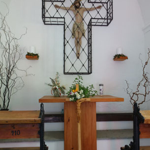 Mit dem mit Blumen geschmückten Pilgerkreuz machen wir uns nach der Andacht in der Burgkapelle auf den Weg. Rudi und Ulli Killinger haben einen sehr schönen und abwechslungsreichen Weg ausgewählt. 26 Personen genießen die Aussicht und das wunderbare Wanderwetter auf dem 9 km langen Rundweg. Nach den Stationen beim Frauenstein und dem Abschluss beim Aigner Kreuz gehen wir schweigend zurück zum Ausgangspunkt und lassen uns das Mittagessen im Restaurant der Burg Kreuzen schmecken.
