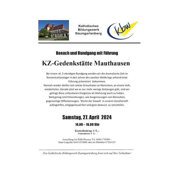 Zusammenkunft ist um 13.15 Uhr am Kirchenvorplatz. Abfahrt nach Mauthausen um 13.30 Uhr in Fahrgemeinschaften!