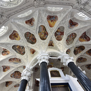 Die barocke Pracht der ehemaligen Stiftskirche prägt den primären Eindruck des Besuchers. Gut zu erkennen sind die mittelalterlichen Baustufen des Hochchors, der Vorhalle und des erhöhten Langhausdaches. Aus der Gründungszeit im 12. Jahrhundert stammt die Westmauer mit dem typisch romanischen Portal.