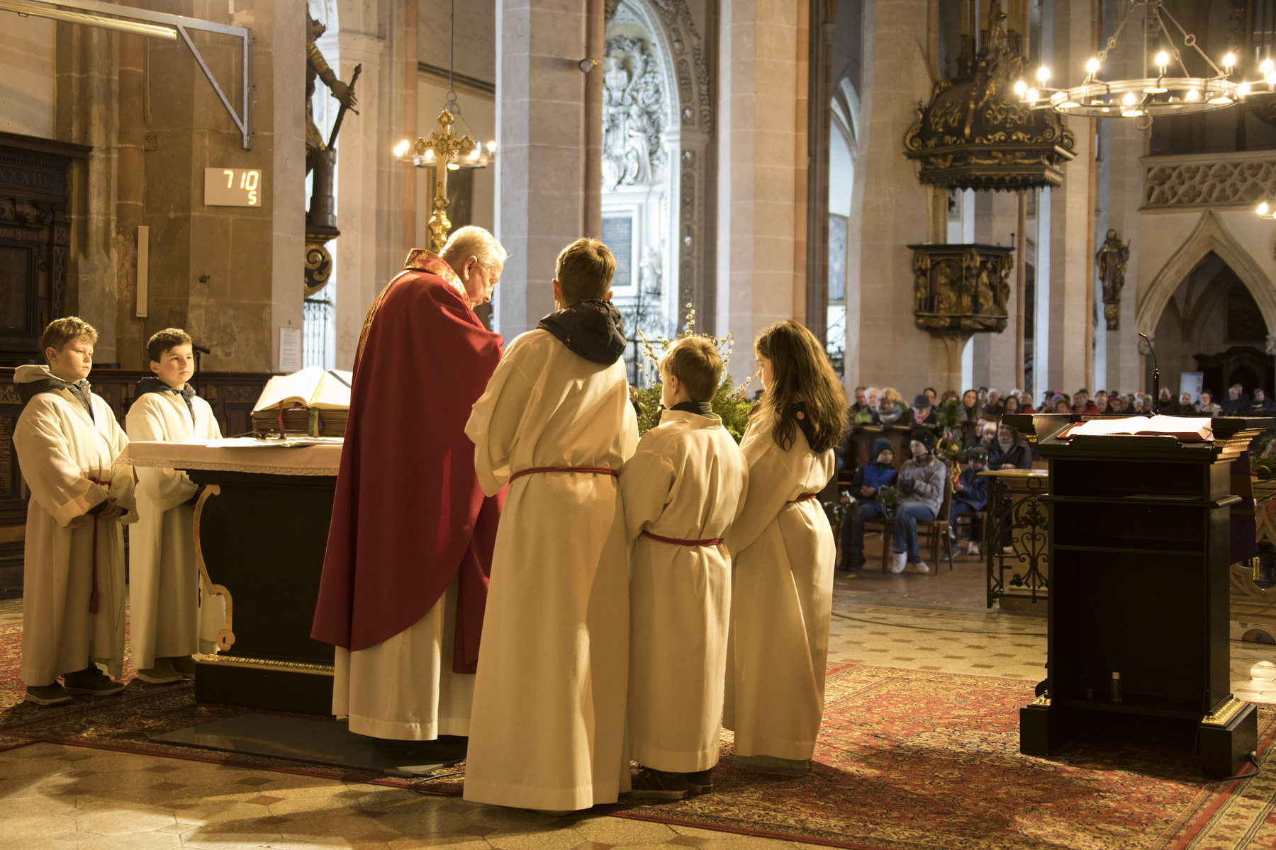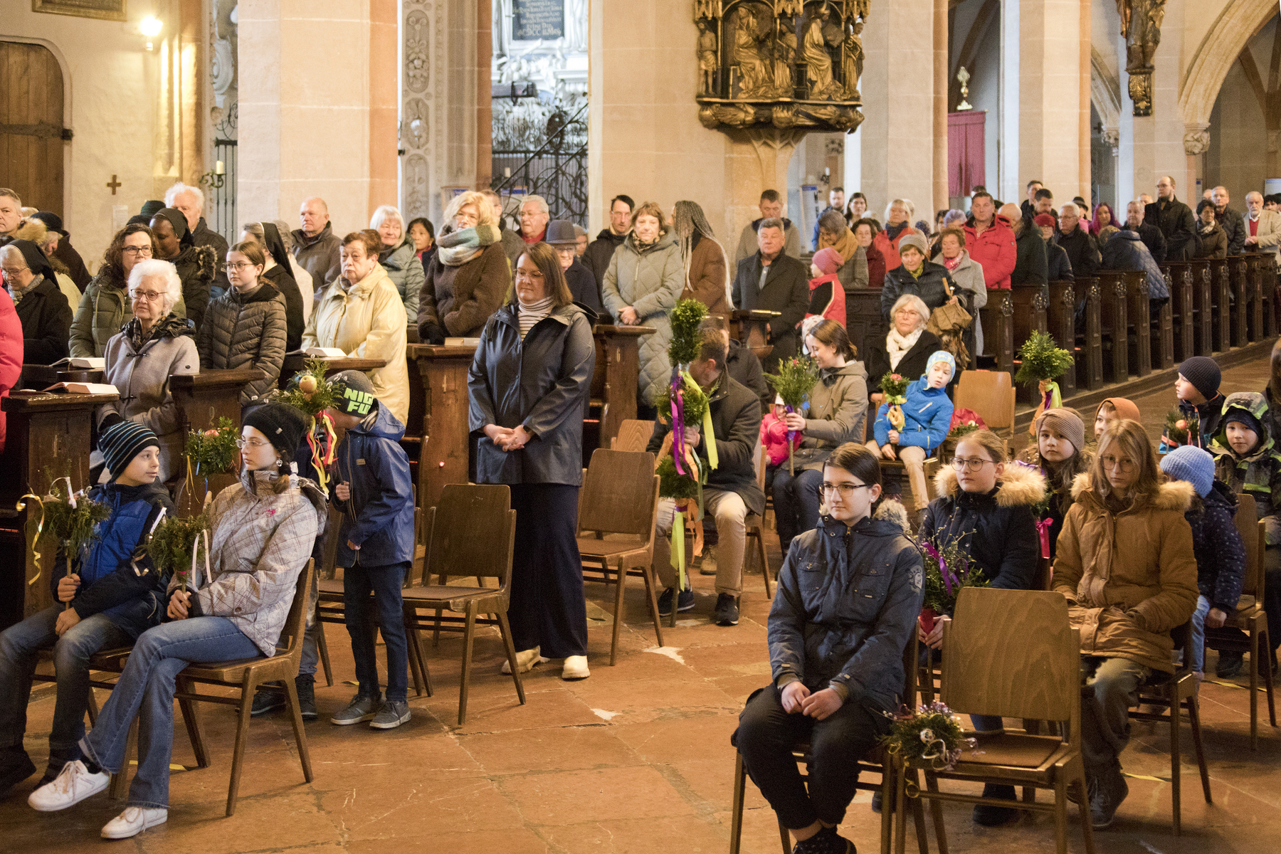 Das regnerische Wetter verhinderte leider heuer die Segnung der Palmbuschen beim Fischbrunnen und die Palmprozession über den Stadtplatz. Der große Kirchenraum von St. Stephan ermöglichte jedoch eine "kleine" Prozession durch die Kirche und einen festlichen Gottesdienst zum Gedenken an Jesu Einzug in Jerusalem mit vielen Kindern, Jugendlichen und Erwachsenen.