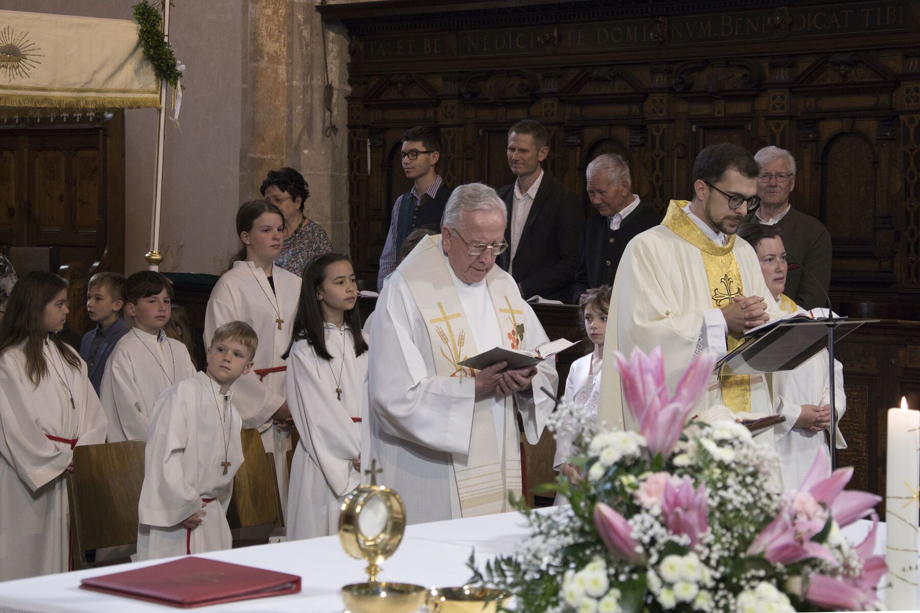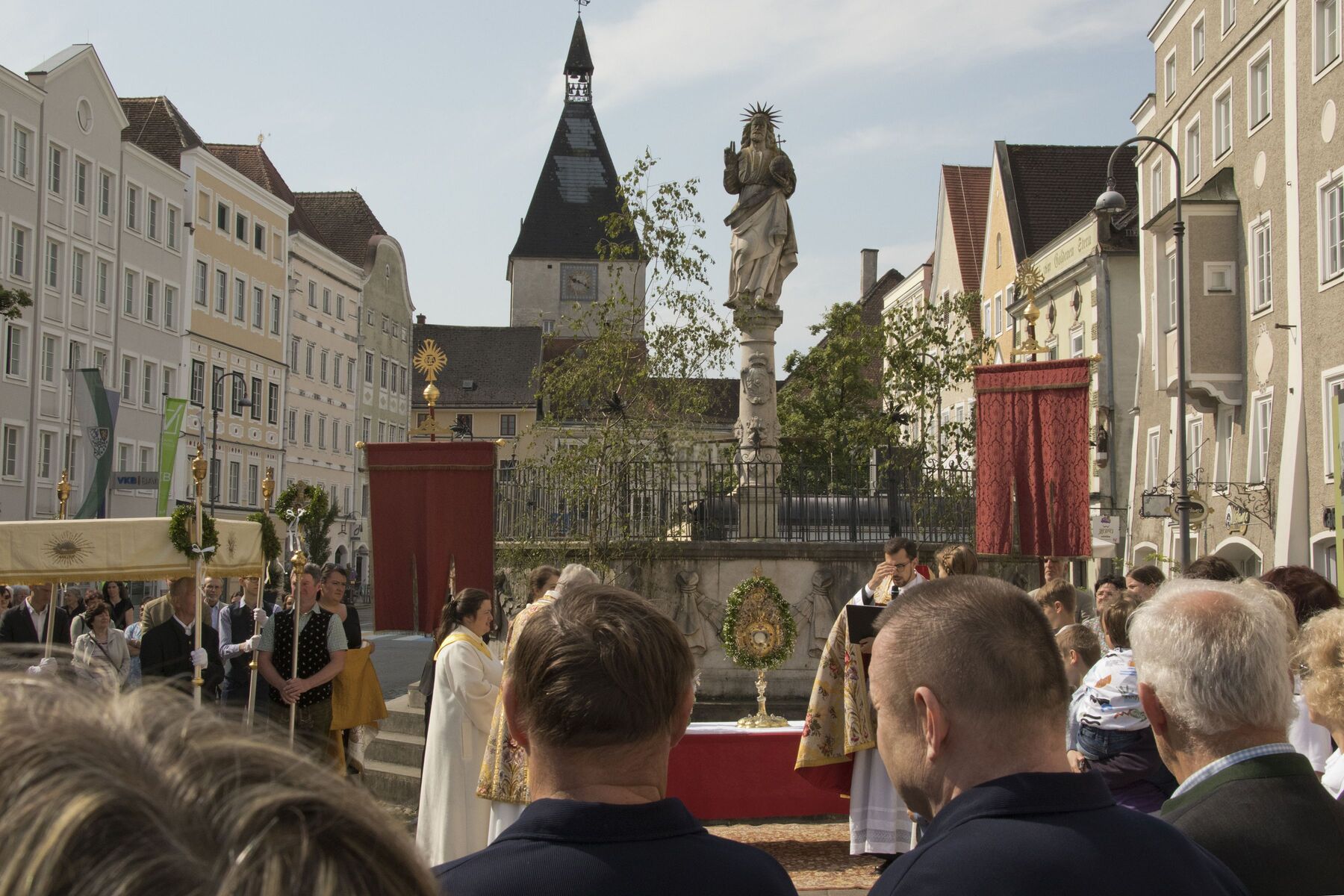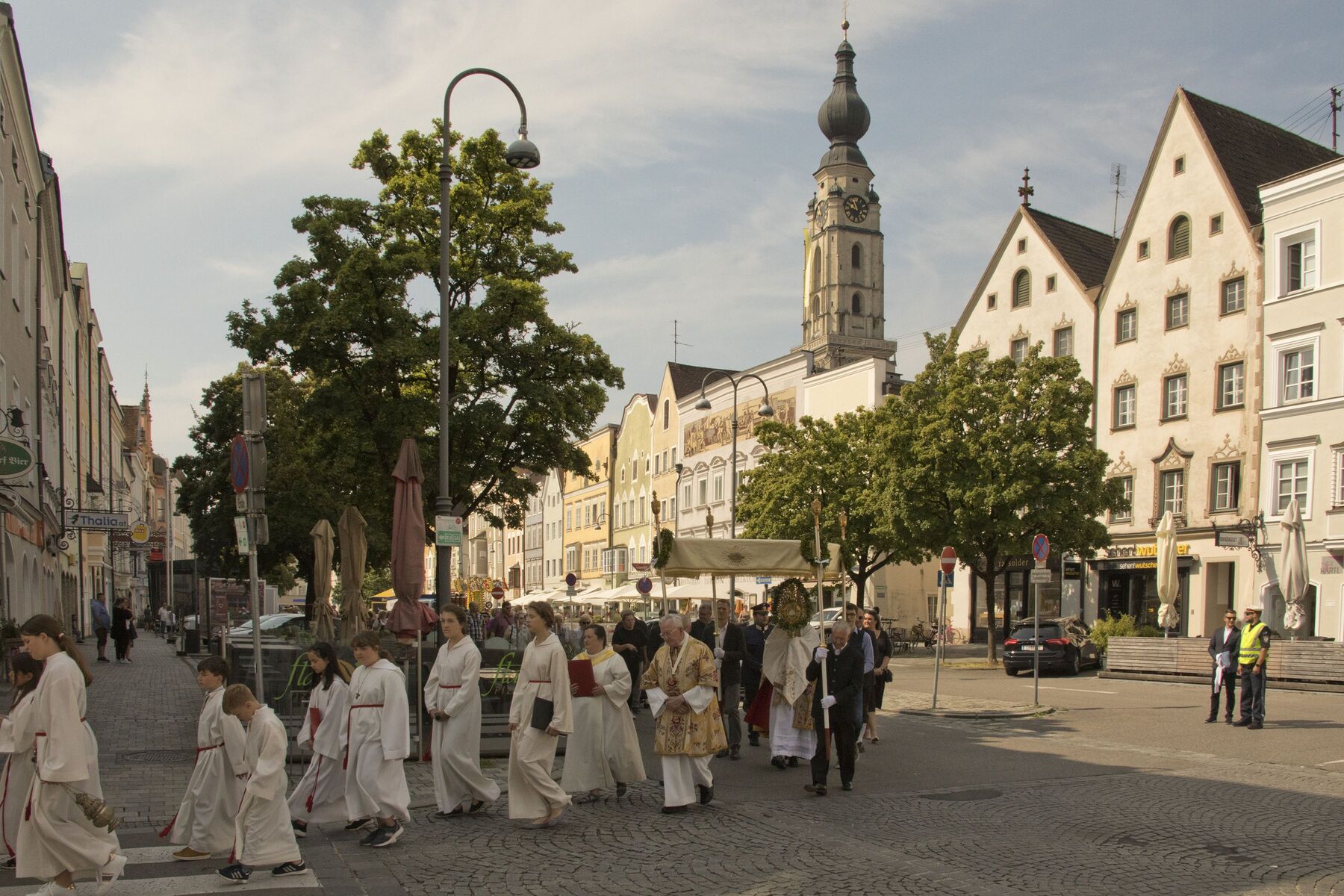 Der herrliche Frühsommertag trug das Seine zum schönen Verlauf und zur festlichen Stimmung bei der gemeinsamen Feier der drei Braunauer Pfarren Maria Königin, St. Franziskus und St. Stephan bei. Den Festgottesdienst in der Stadtpfarrkirche St. Stephan feierten Kaplan Philipp Faschinger, Monsignore Stefan Hofer und Seelsorgerin Elisabeth Kronreif mit einer großen Feiergemeinde, Vertretern der Stadt Braunau, Abordnungen verschiedener Vereine, Erstkommunionkindern und vielen Männern und Frauen aus den Pfarrgemeinden.