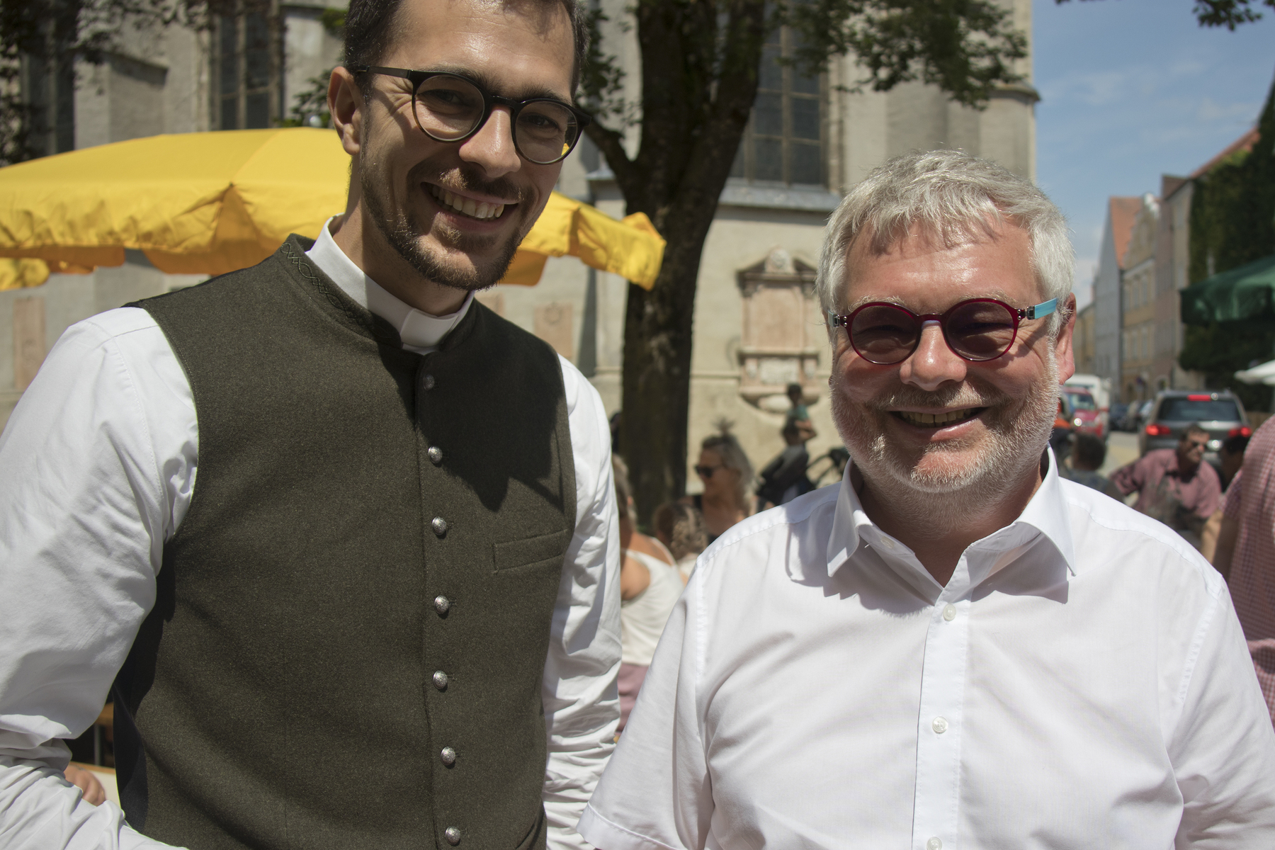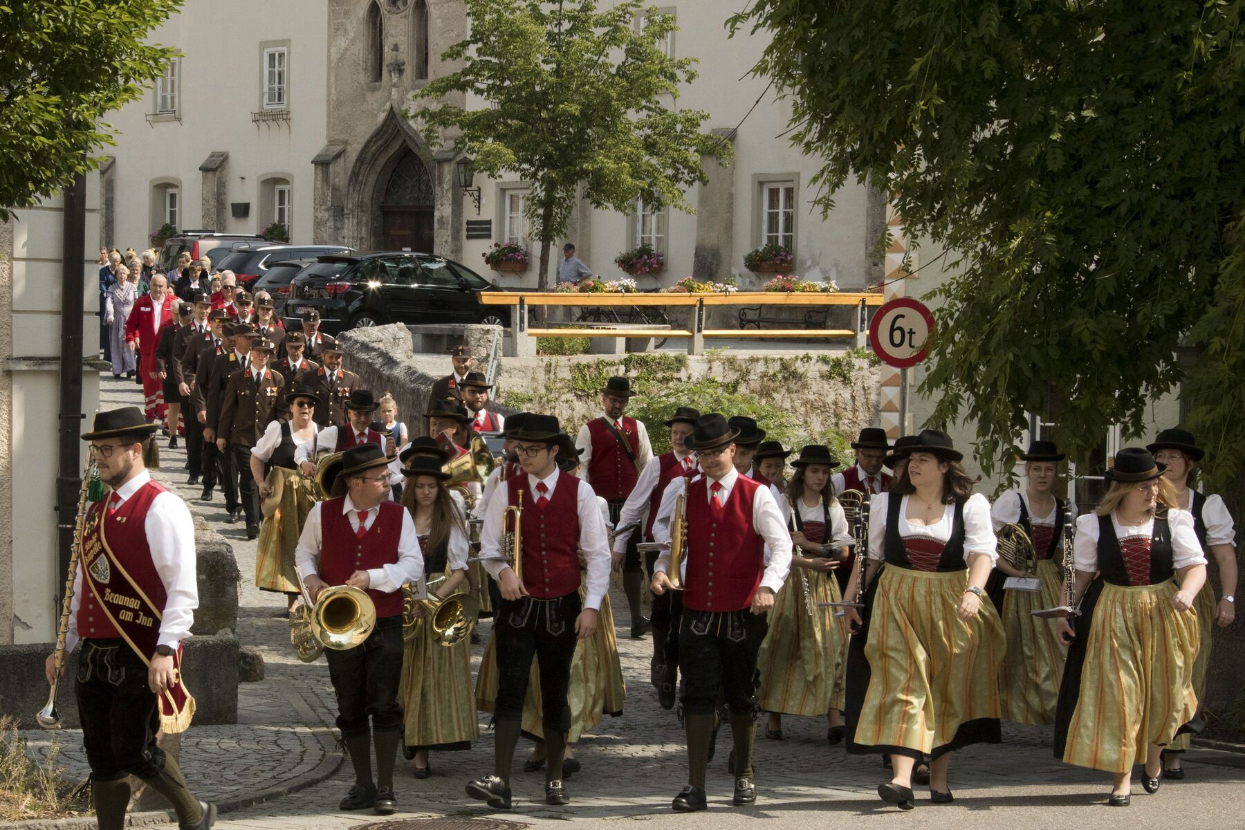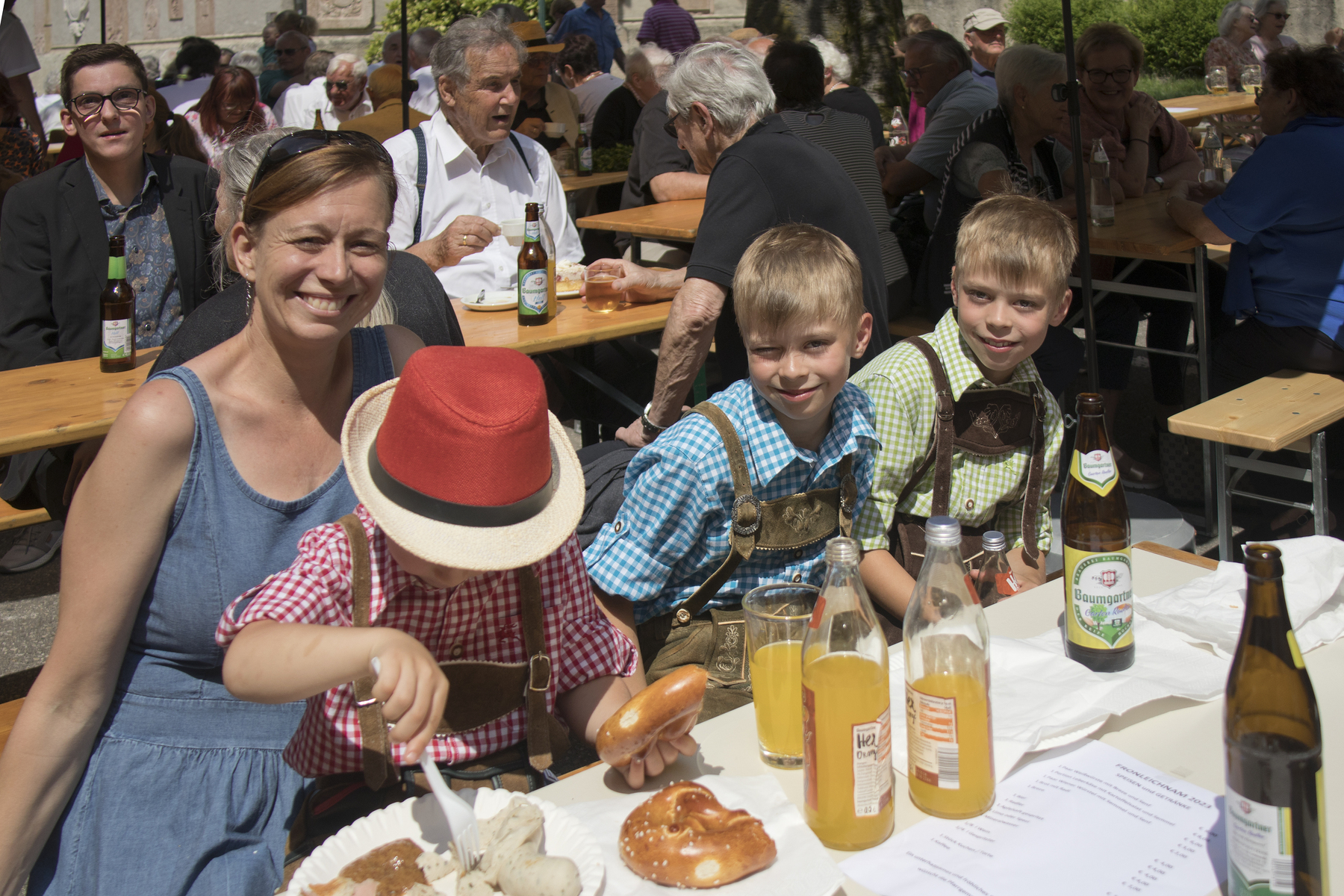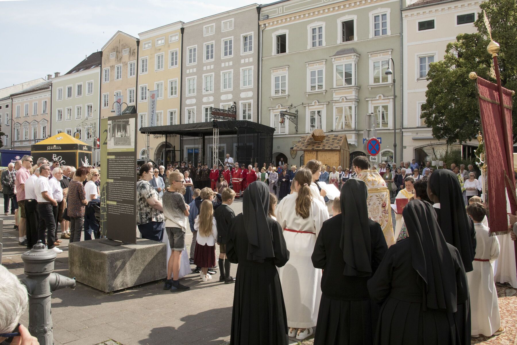 Am Kirchenplatz war schon alles vorbereitet für den anschließenden Frühschoppen mit einem reichhaltigen kulinarischen Angebot. Die Stadtkapelle sorgte mit Musik und Gesang für eine besonders gute Stimmung bei allen BesucherInnen. Auch die Gäste des Internationalen Zwillingstreffens, die sich zum Teil eine Woche in Braunau aufhielten und schon am liturgischen Teil des Fests teilgenommen hatten, waren begeistert von der besten Laune, die am Kirchenplatz erlebbar war.