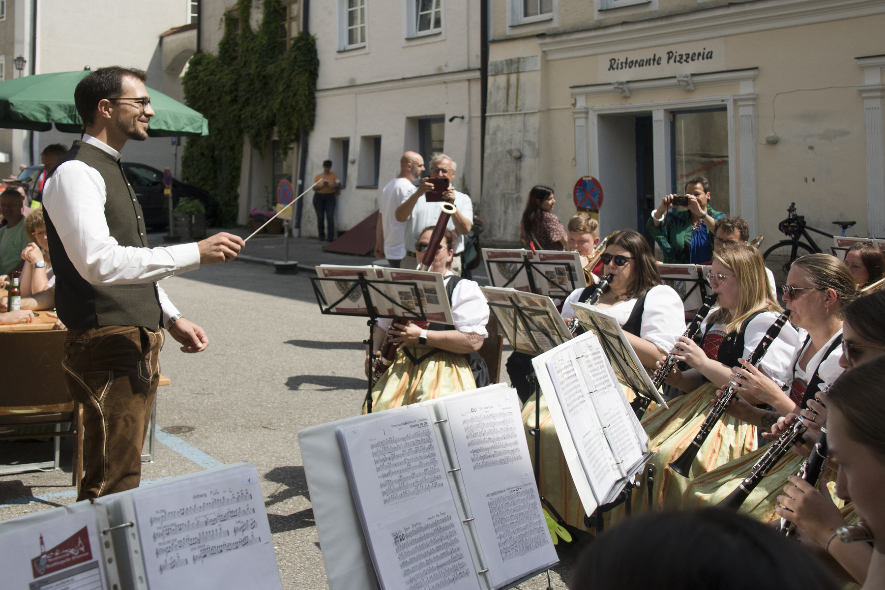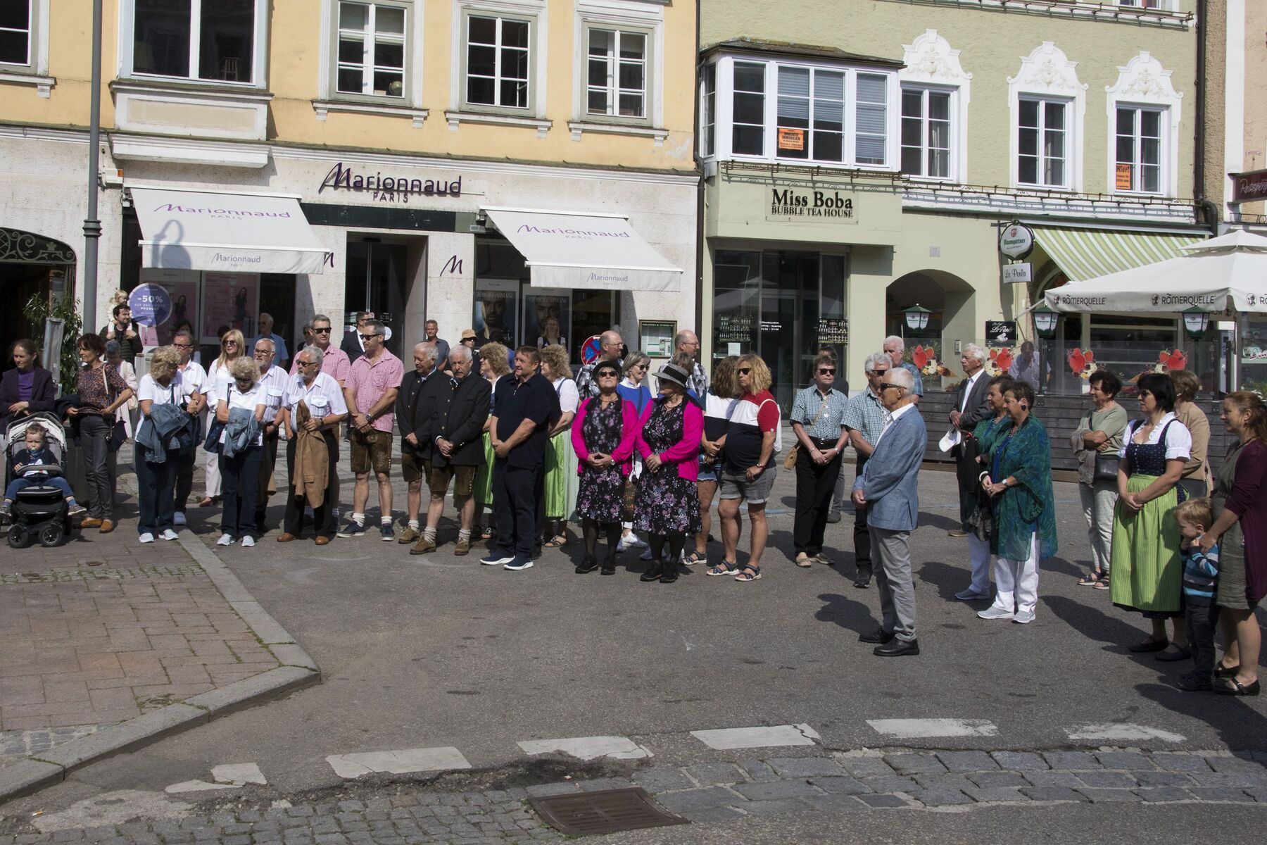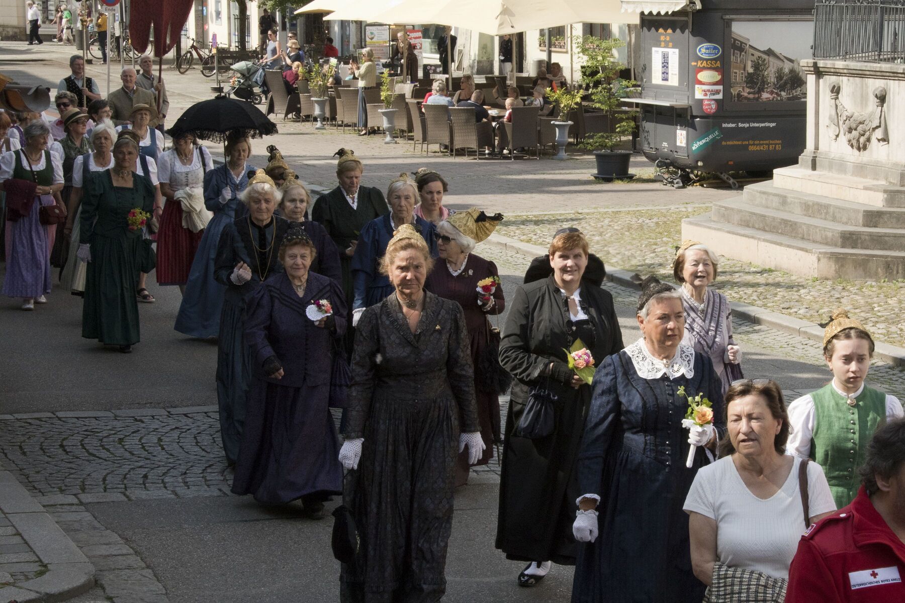 Am Kirchenplatz war schon alles vorbereitet für den anschließenden Frühschoppen mit einem reichhaltigen kulinarischen Angebot. Die Stadtkapelle sorgte mit Musik und Gesang für eine besonders gute Stimmung bei allen BesucherInnen. Auch die Gäste des Internationalen Zwillingstreffens, die sich zum Teil eine Woche in Braunau aufhielten und schon am liturgischen Teil des Fests teilgenommen hatten, waren begeistert von der besten Laune, die am Kirchenplatz erlebbar war.
