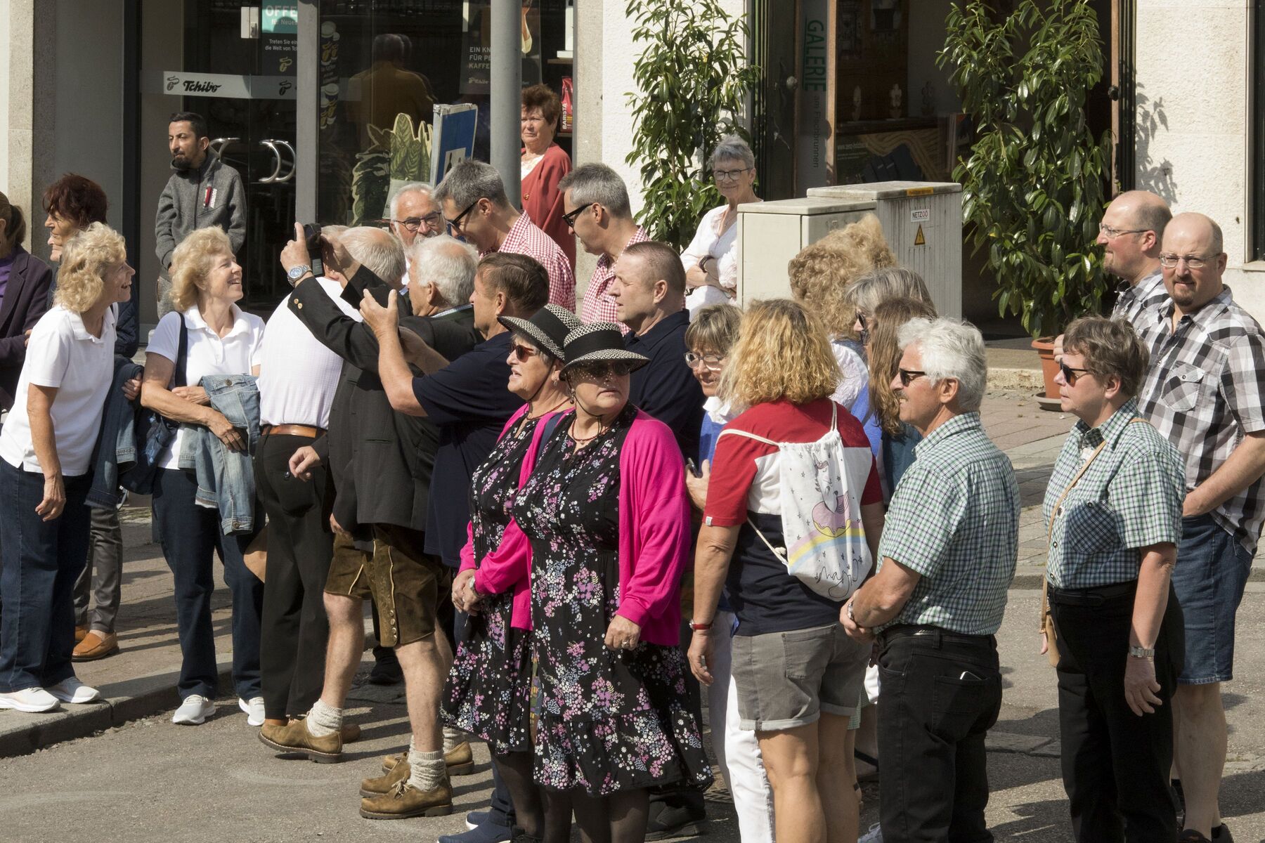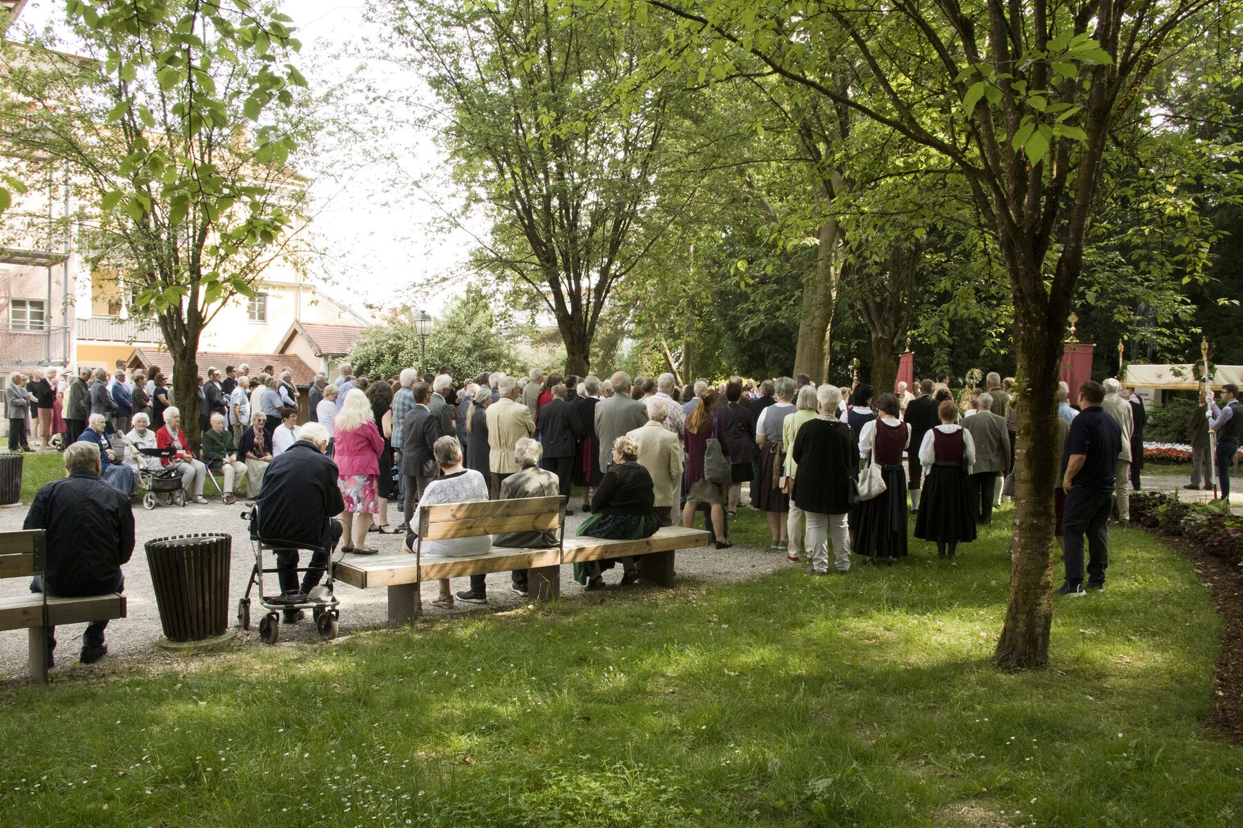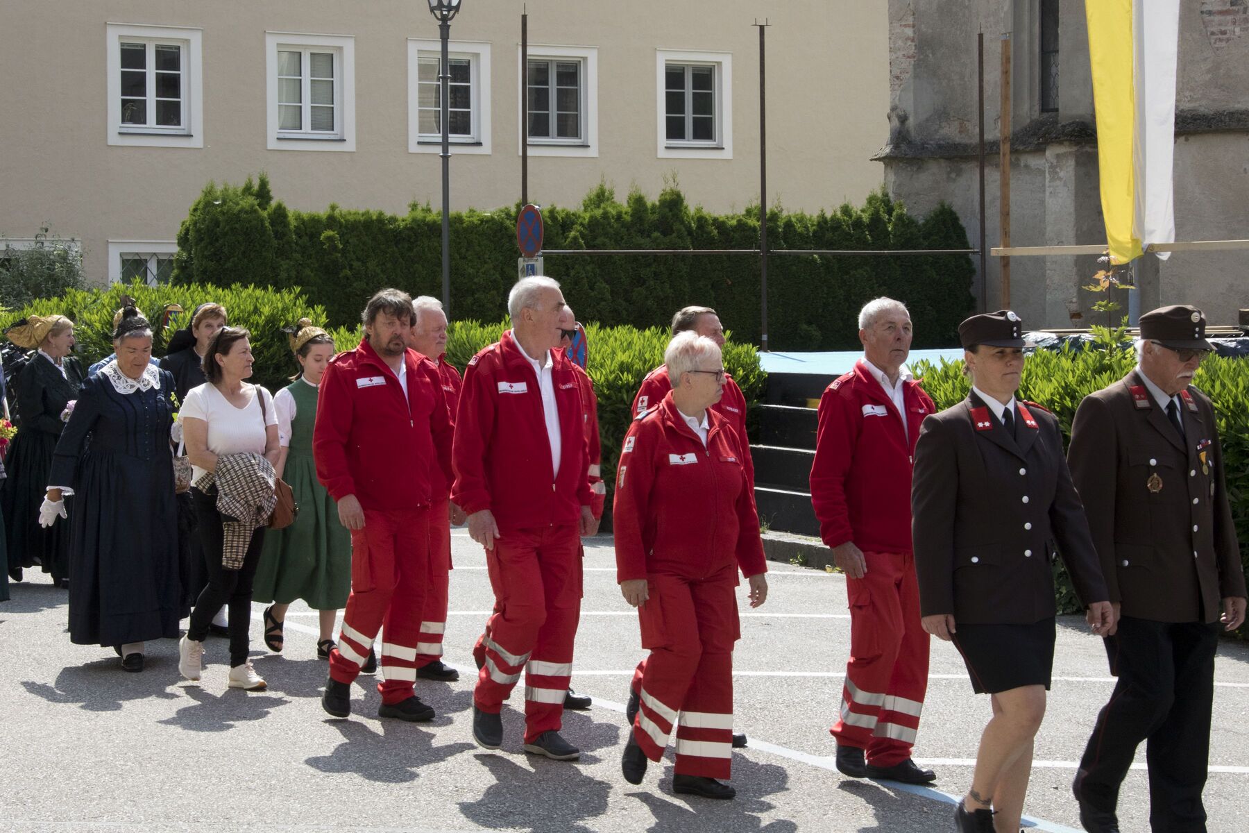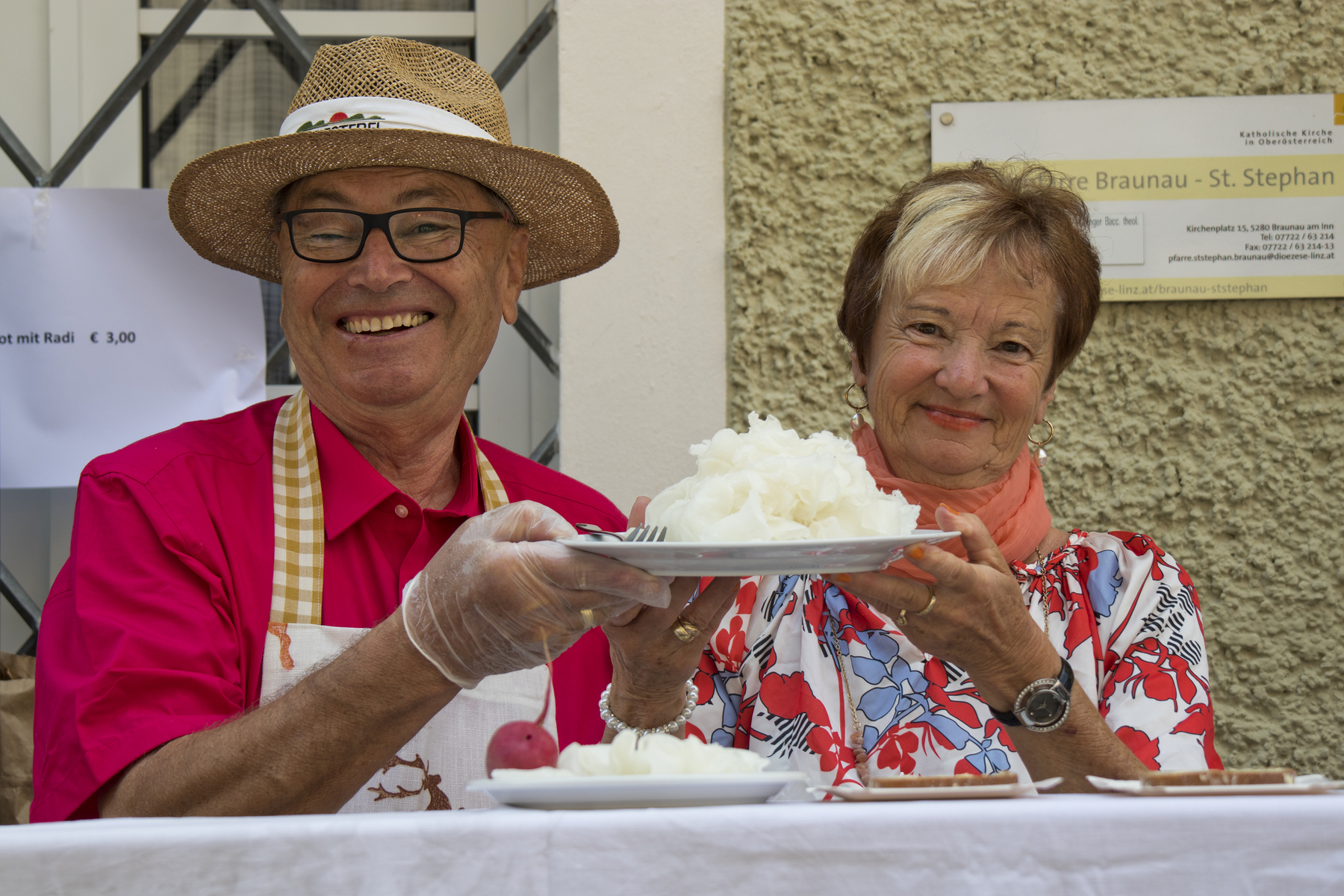 Am Kirchenplatz war schon alles vorbereitet für den anschließenden Frühschoppen mit einem reichhaltigen kulinarischen Angebot. Die Stadtkapelle sorgte mit Musik und Gesang für eine besonders gute Stimmung bei allen BesucherInnen. Auch die Gäste des Internationalen Zwillingstreffens, die sich zum Teil eine Woche in Braunau aufhielten und schon am liturgischen Teil des Fests teilgenommen hatten, waren begeistert von der besten Laune, die am Kirchenplatz erlebbar war.