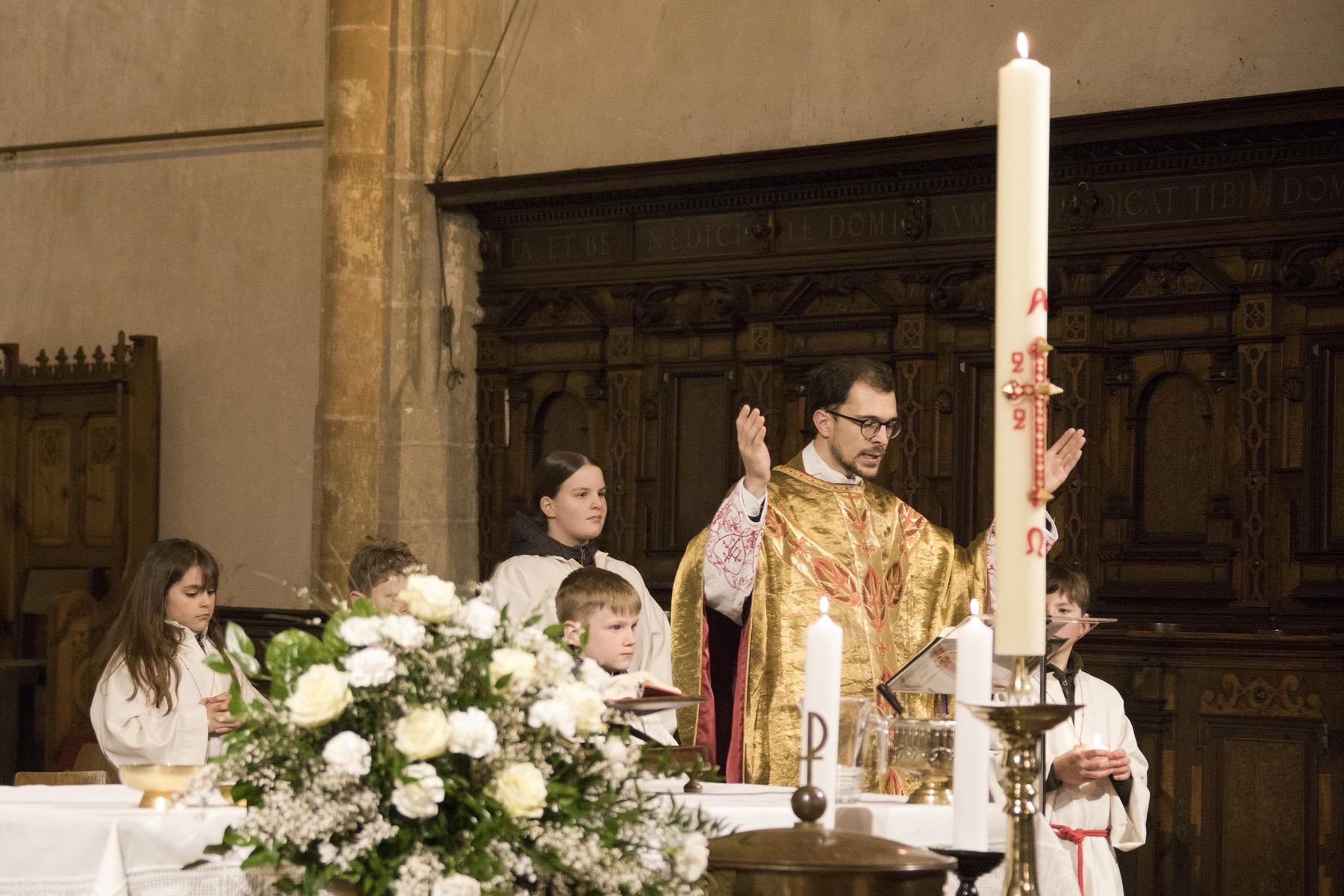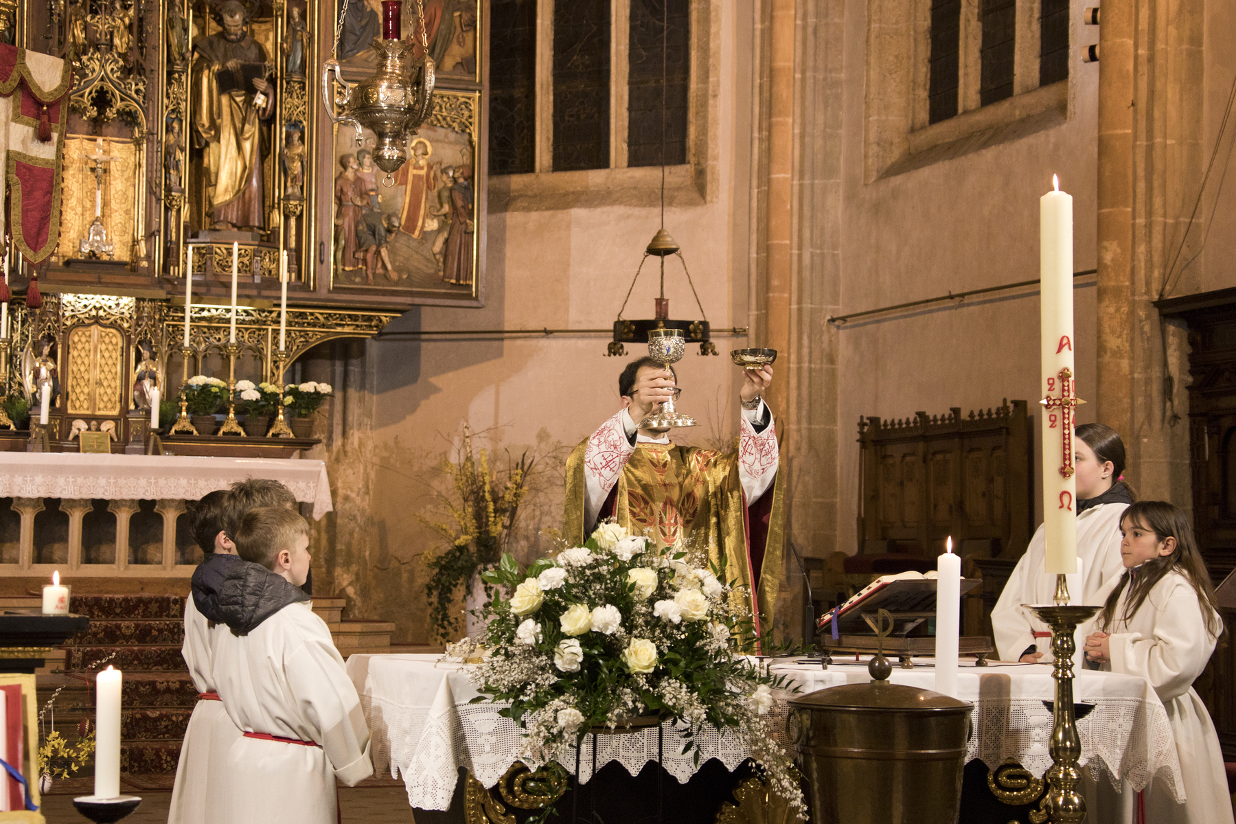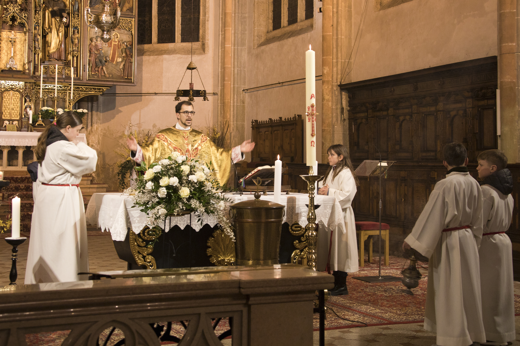 In ihrem vollen Glanz erstrahlte die Stadtpfarrkirche St. Stephan nach der langen Zeit der Kargheit in der Liturgie am Karsamstag zur Auferstehungsfeier für Familien und Kinder bzw. abends zur Feier der Osternacht.