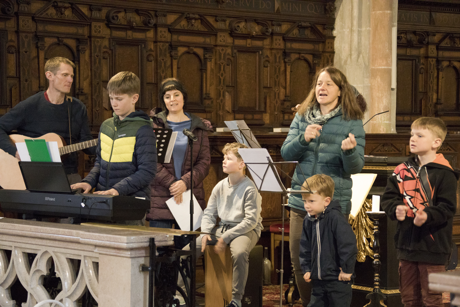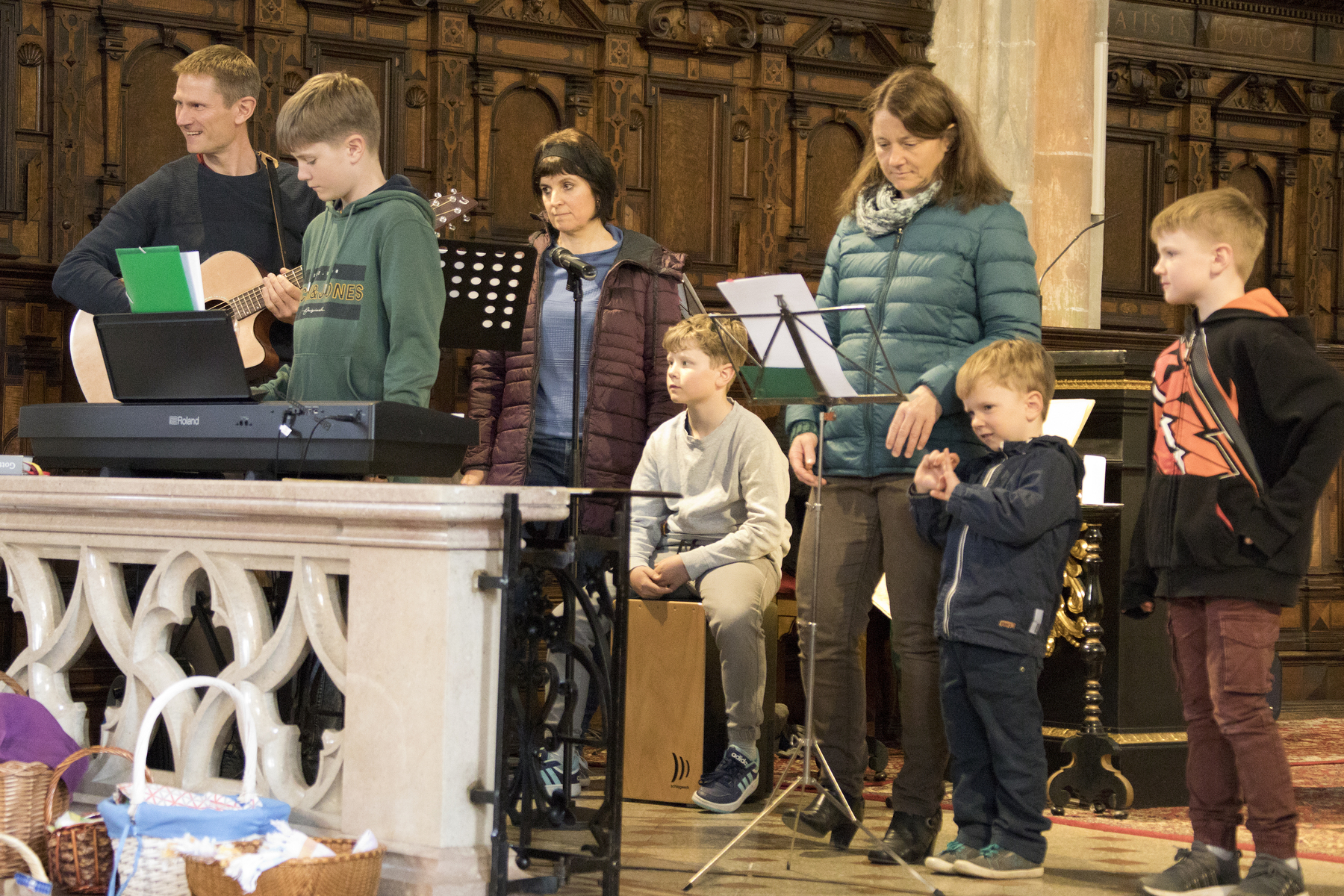 Am Nachmittag feiert Kaplan Philipp Faschinger mit den Familien die von Familie Karin und Christian Schmid musikalisch gestaltete Wort-Gottes-Feier mit dem Thema des leeren Grabes. "Der Stein ist weg, das Grab ist leer" - das Thema "Auferstehungs-Erlebnisse im Alltag der Kinder" entfaltete Kaplan Philipp in seiner Predigt gemeinsam mit den Kindern.