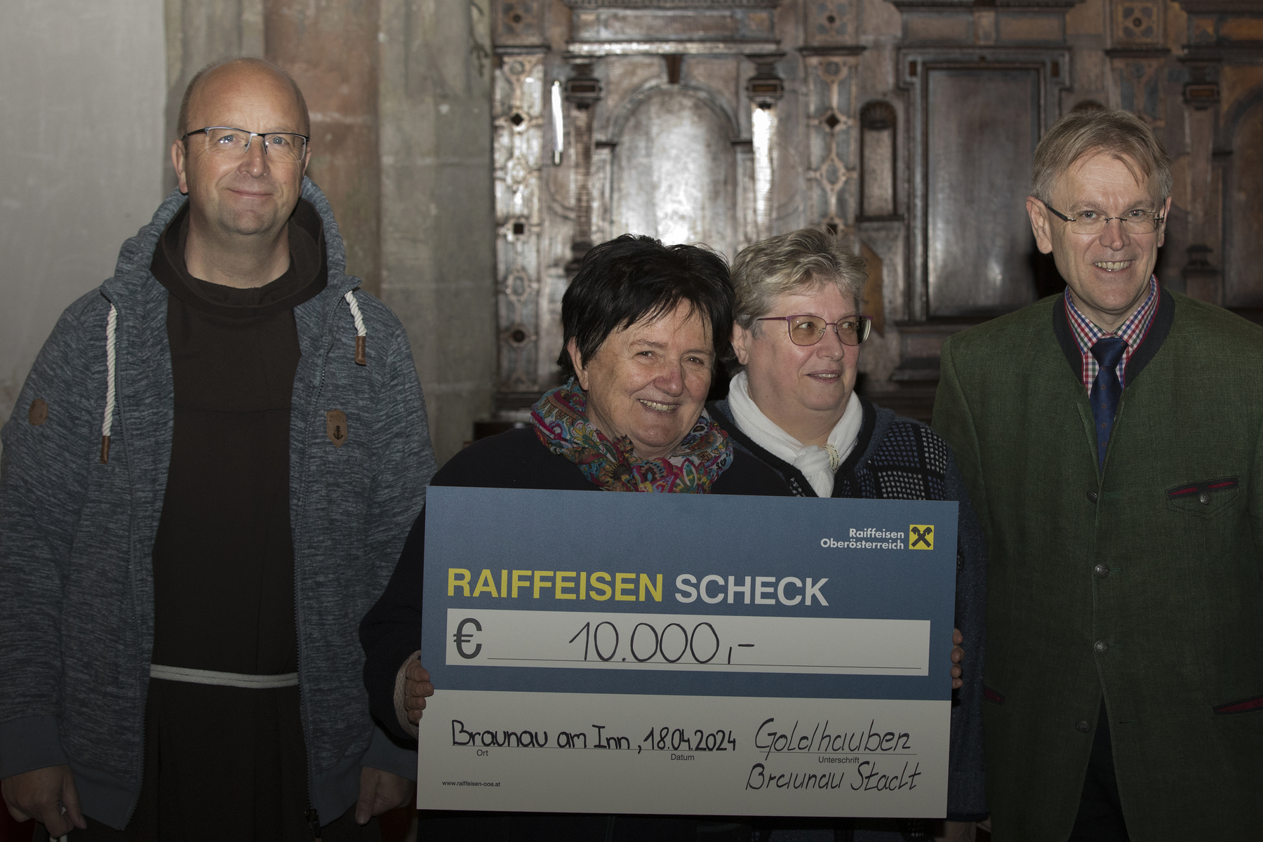 Die Goldhaubengruppe Braunau-Stadt, die MitarbeiterInnen der Pfarrgemeinde St. Stephan und alle anderen Beteiligten hatten mit Unterstützung der Spenderinnen und Spender großartige Arbeit geleistet, sodass am 18. April ein Scheck mit der respektablen Summe von EUR 10.000 an die Vertretung der Leitung der Pfarrgemeinde übergeben werden konnte.