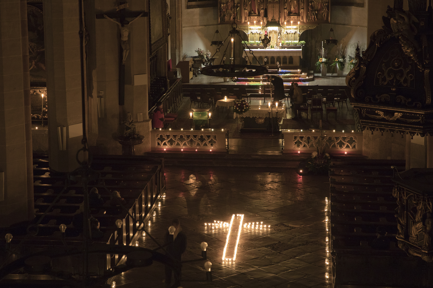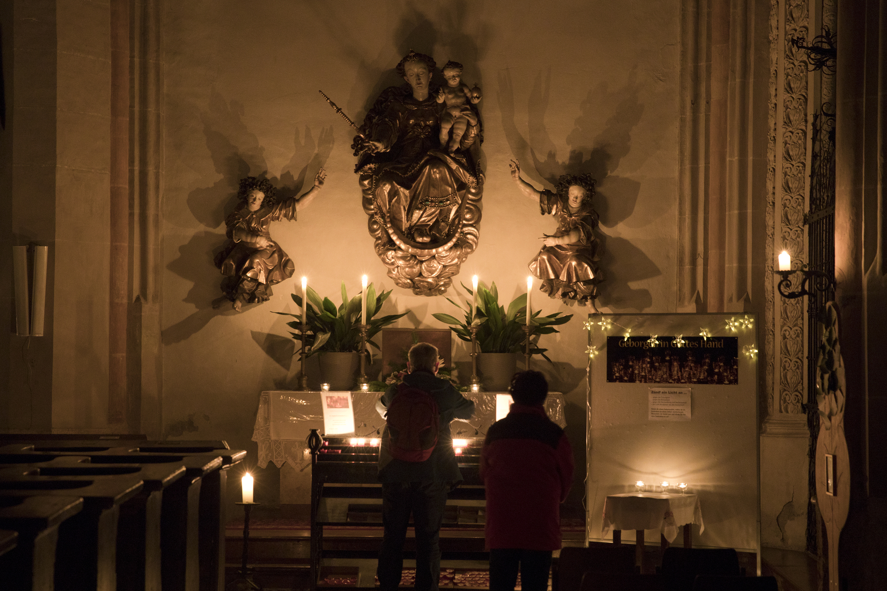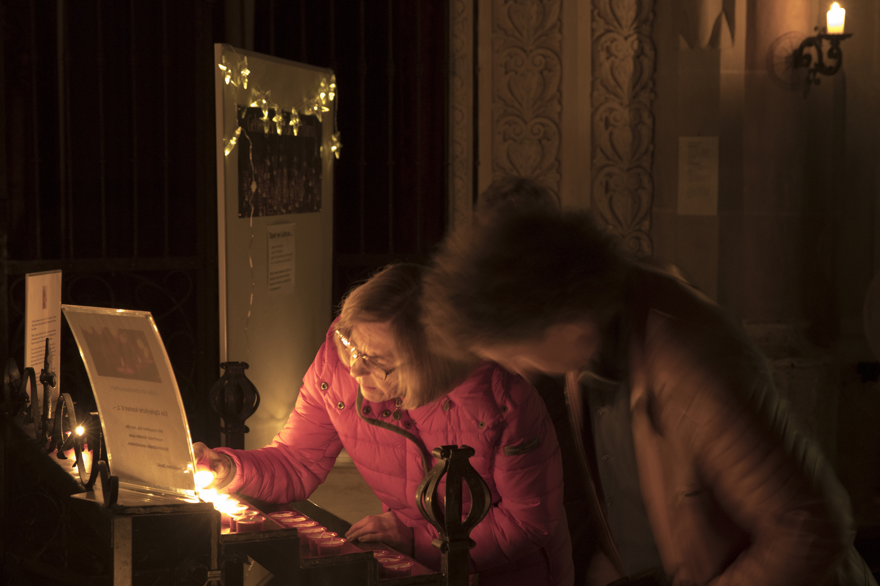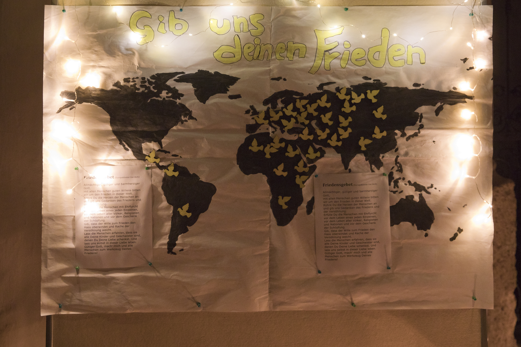 "Zünd' ein Licht an" hieß es beim Marienaltar, wo Gebete für Verstorbene bereitlagen und man im stillen Gedenken an liebe Menschen eine Kerze anzünden konnte. "Beten für den Frieden" war das Motto an anderer Stelle, wo man Friedenstauben auf der Weltkarte positionieren konnte und Friedensgebete angeboten wurden. Manchen BesucherInnen gingen den Weg durchs Labyrinth, wieder andere genossen den schönen Ausblick von der Orgel-Empore auf das Lichtermeer. Meditative Musik war auch als Live-Musik dargeboten von Herbert Hauser an der Ziehharmonika zu hören.