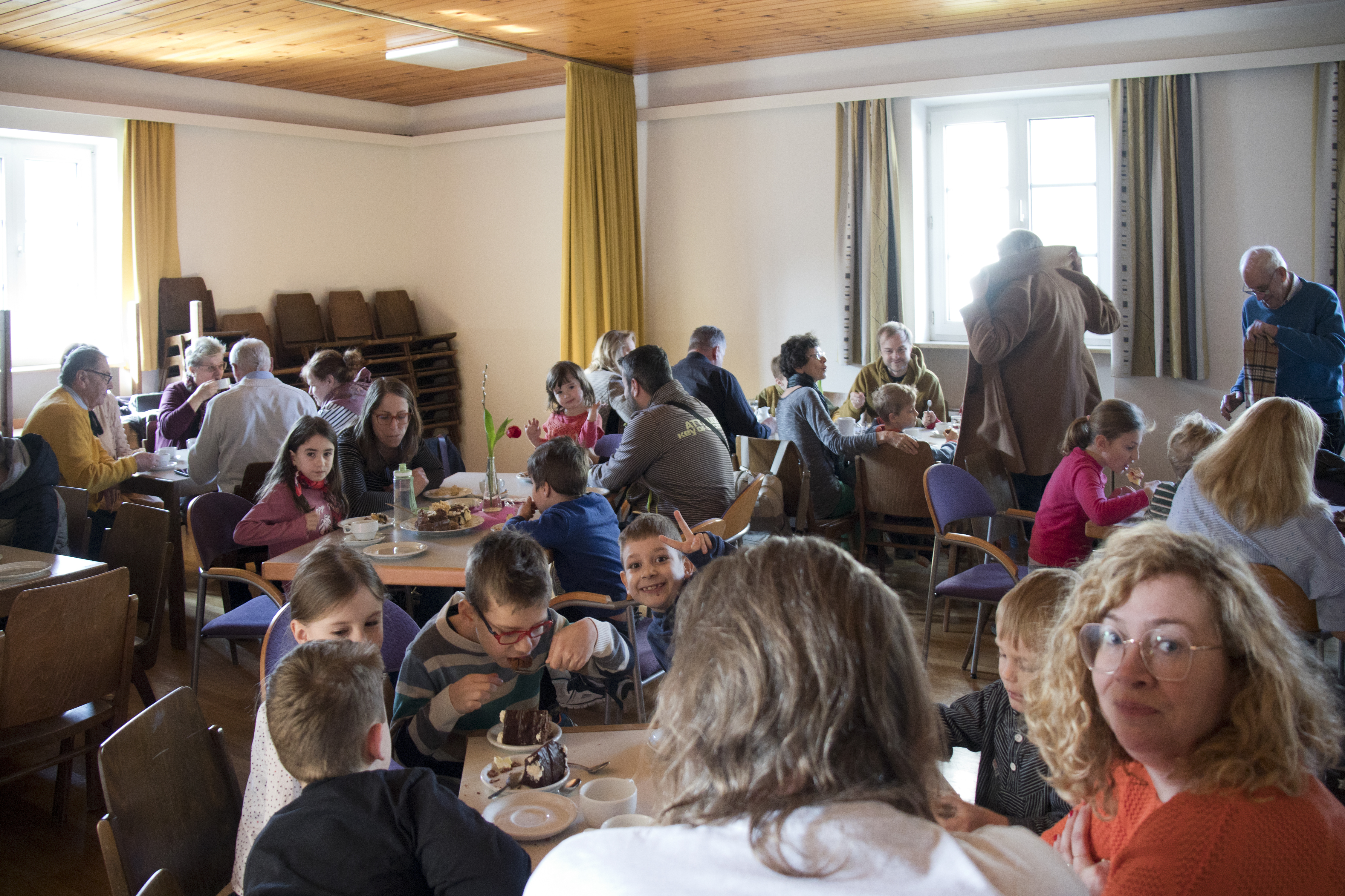In der Fastenzeit sollte man sich bemühen, Versuchungen und Verlockungen zu widerstehen, doch bei einer derart vielfältigen Kuchenauswahl, die Mütter (und Väter) für das Pfarrcafé ihrer Erstkommunionkinder bereitstellten, fiel einem das wirklich schwer. Der Andrang im Pfarrsaal war dementsprechend groß, sodass weitere Tisch- und Sessel-Reserven aktiviert werden mussten. Die Kinder waren mit Eifer dabei, die BesucherInnen zu verwöhnen und die Eltern halfen fleißig mit.