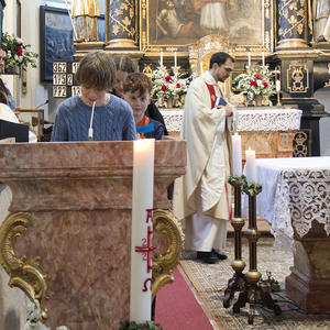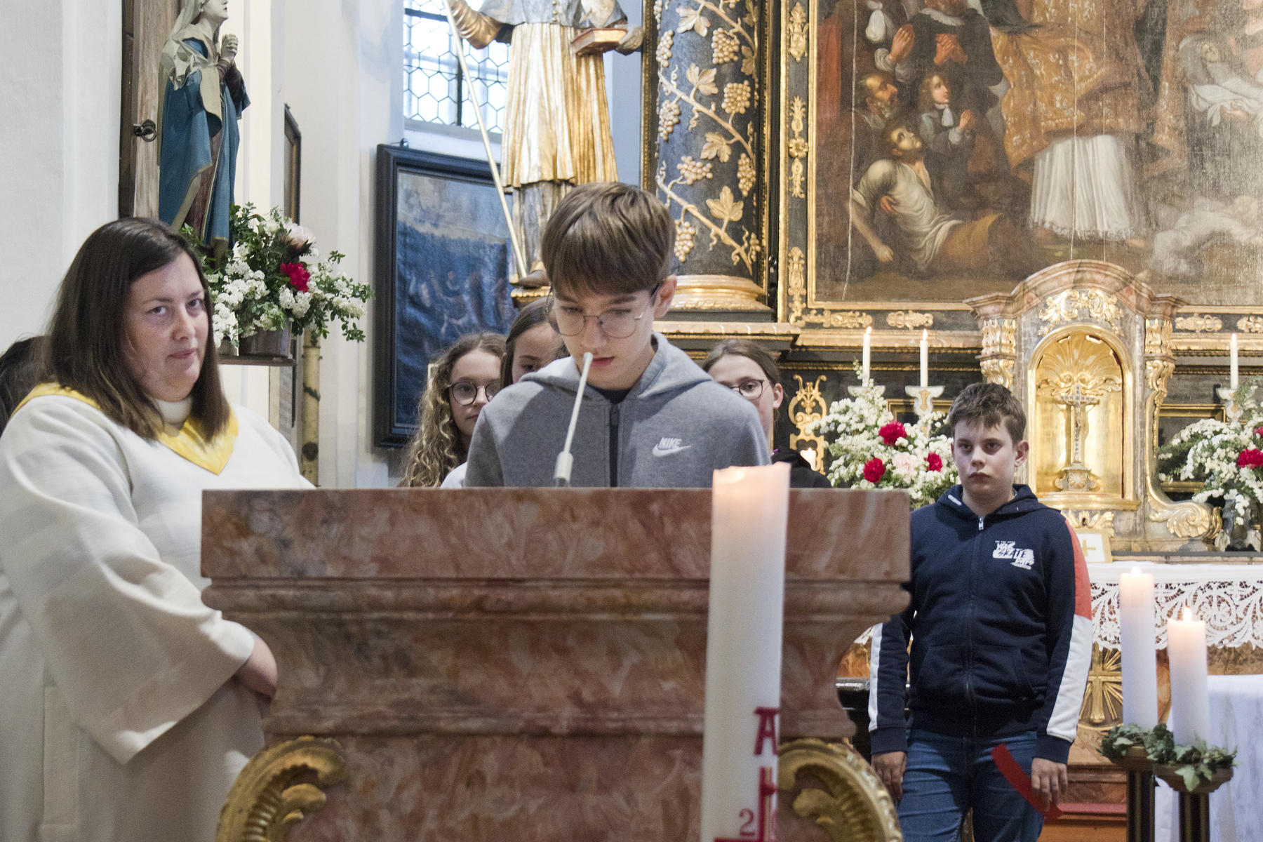 Gemeinsam mit Kaplan Philipp Faschinger, der Grundfunktionsbeauftragten für Verkündigung der Pfarre Braunau, Mag. Elisabeth Kronreif, den Firmbegleiterinnen Matea Sekerija und Magdalena Lagetar und vielen Eltern feierten sie in der Valentinskirche in Braunau-Haselbach, dass sie nach einigen Monaten der Vorbereitungszeit in den Gruppen nun in wenigen Wochen das große Fest der Firmung erleben können.