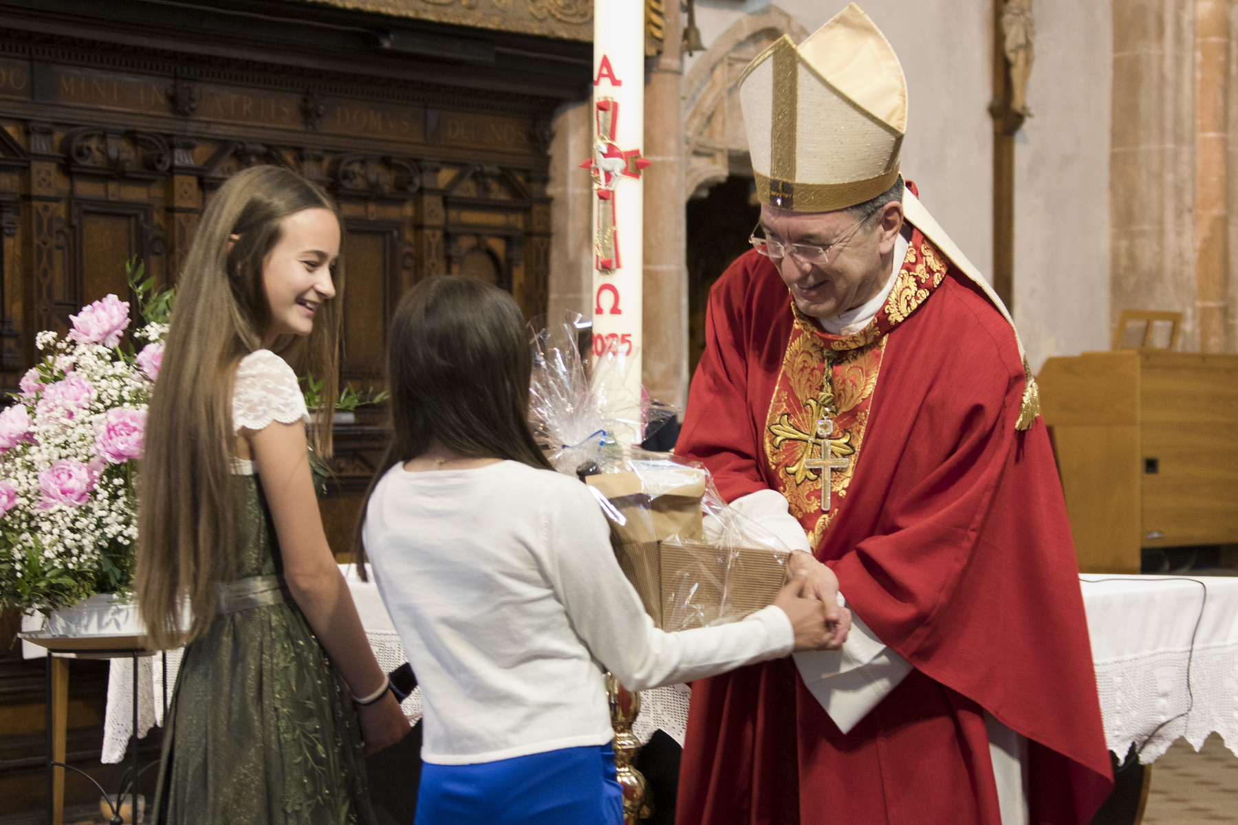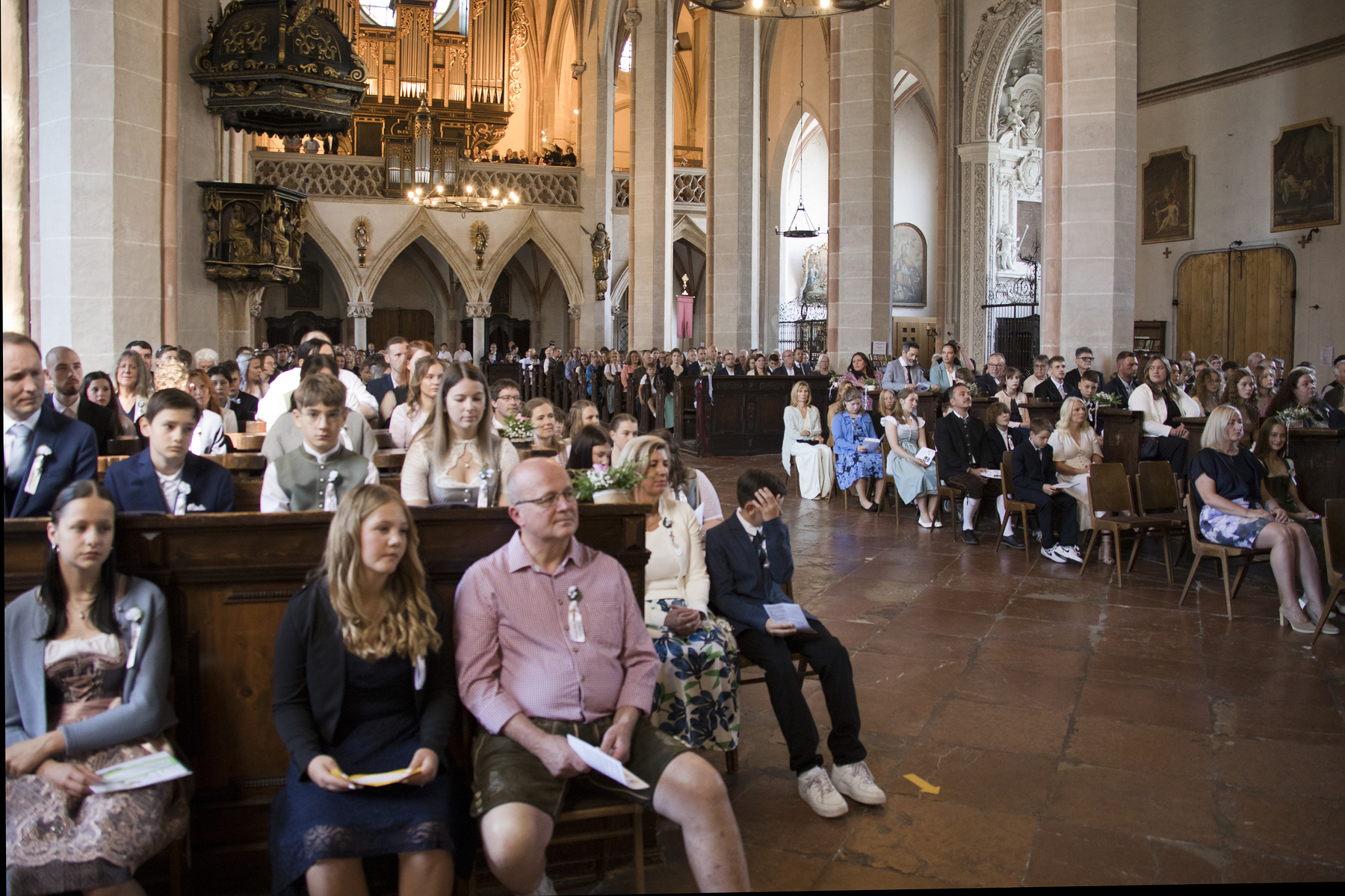 Für jede und jeden der Firmlinge fand Erzabt em. Korbinian bei der Firmspendung im direkten Kontakt persönliche Worte des Interesses und der Wertschätzung. Bei vielen Jugendlichen waren zahlreiche Familienmitglieder und Freunde/Freundinnen mitgekommen, sodass die große Stadtpfarrkirche bis zu den letzten Reihen fast ganz voll war.