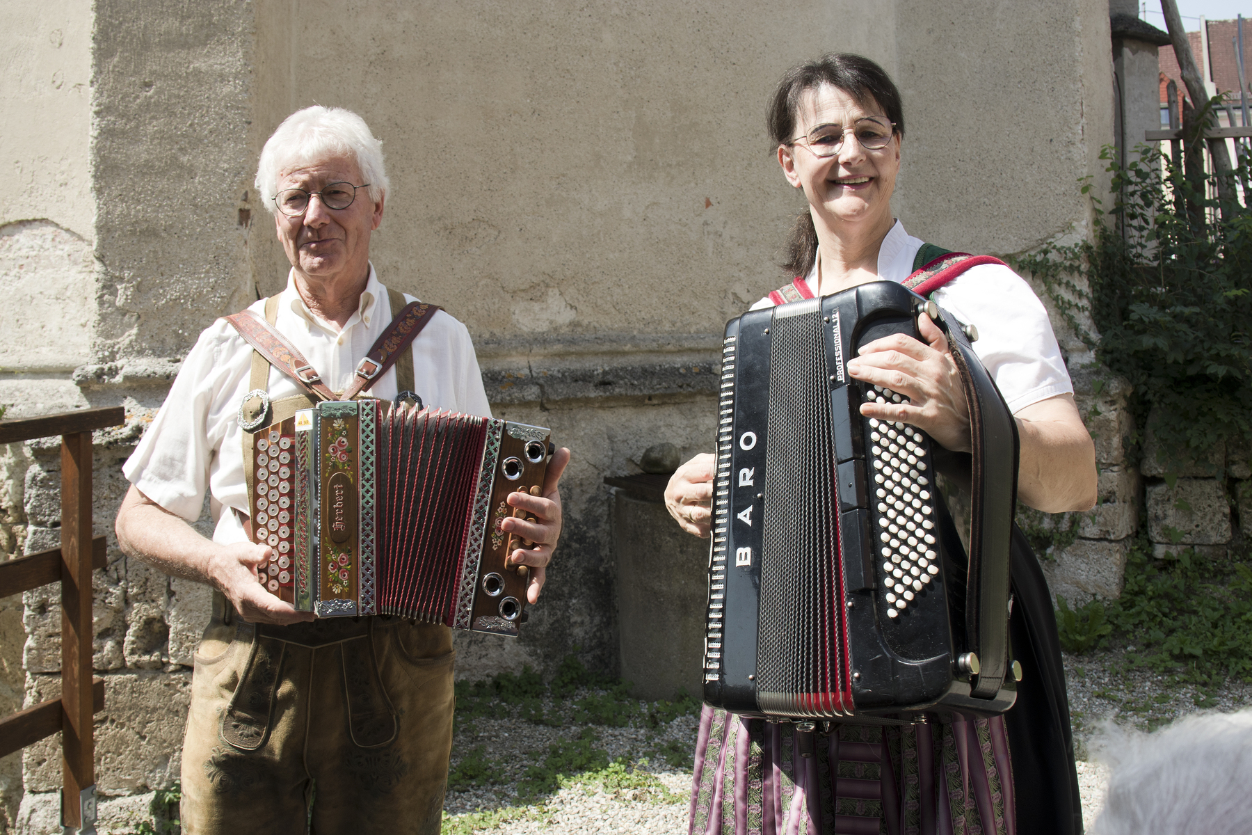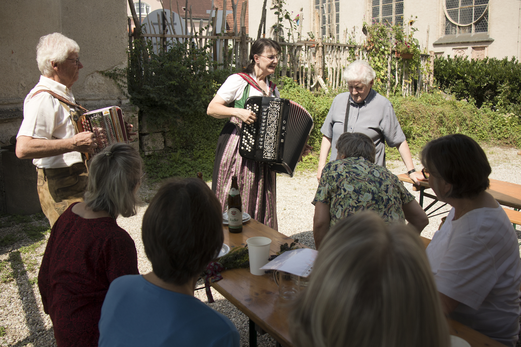 Am Ende des Gottesdienstes wurden die wunderbar duftenden Kräutersträußchen, die die fleißigen Frauen gebunden hatten, gesegnet und an den Kirchentüren verteilt. Im Pfarrheim und im gesamten Außenbereich warteten schon die vorbereiteten Sitzgelegenheiten und in der Küche Speis' und Trank - alles am frühen Morgen bereits von den eifrigen Helferinnen und Helfern bereitgestellt - auf die Gäste. Die "Guat-Drauf-Musi", erweitert durch Herbert Hauser an der Ziehharmonika, sorgte für gute Stimmung.
