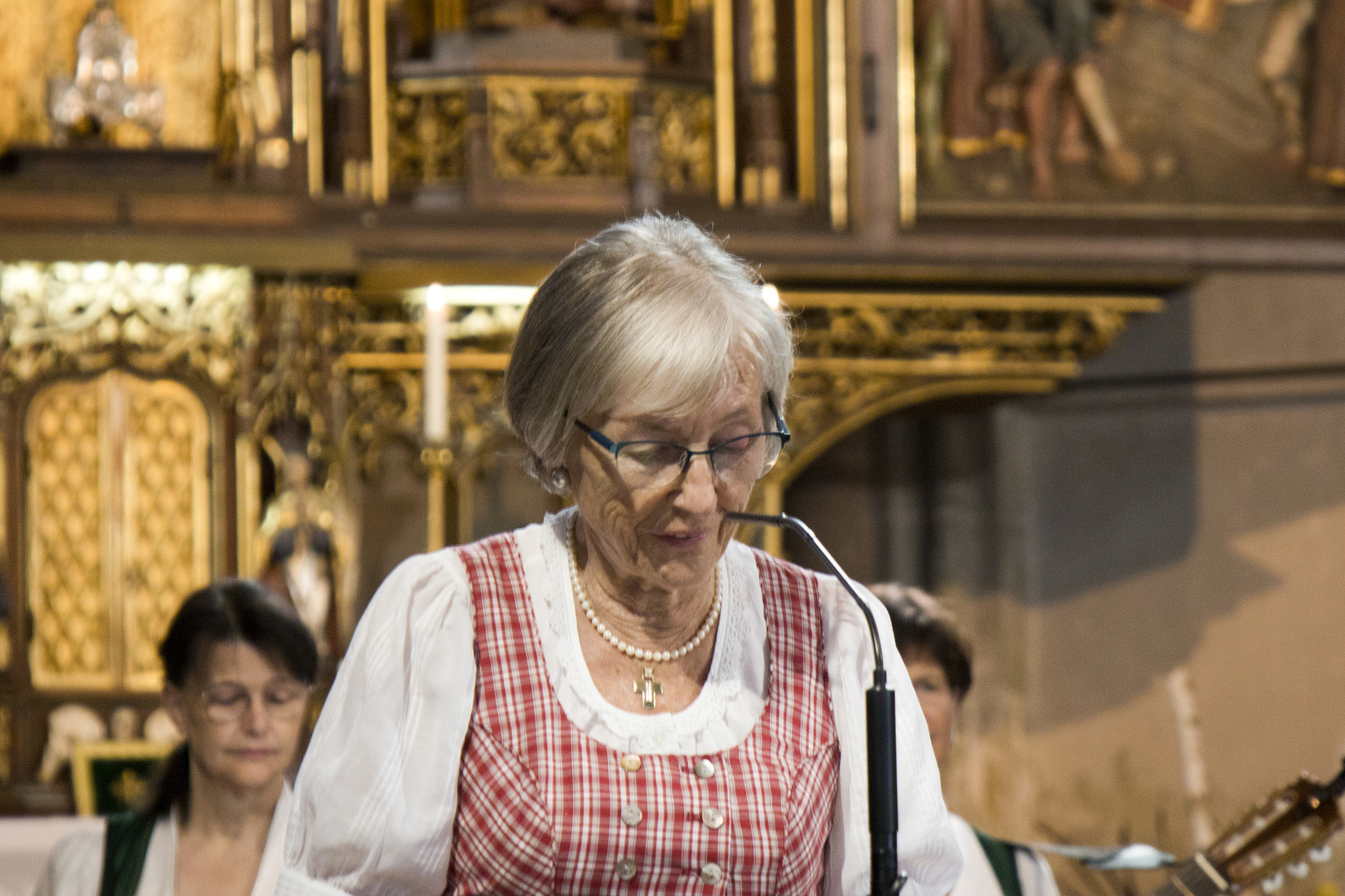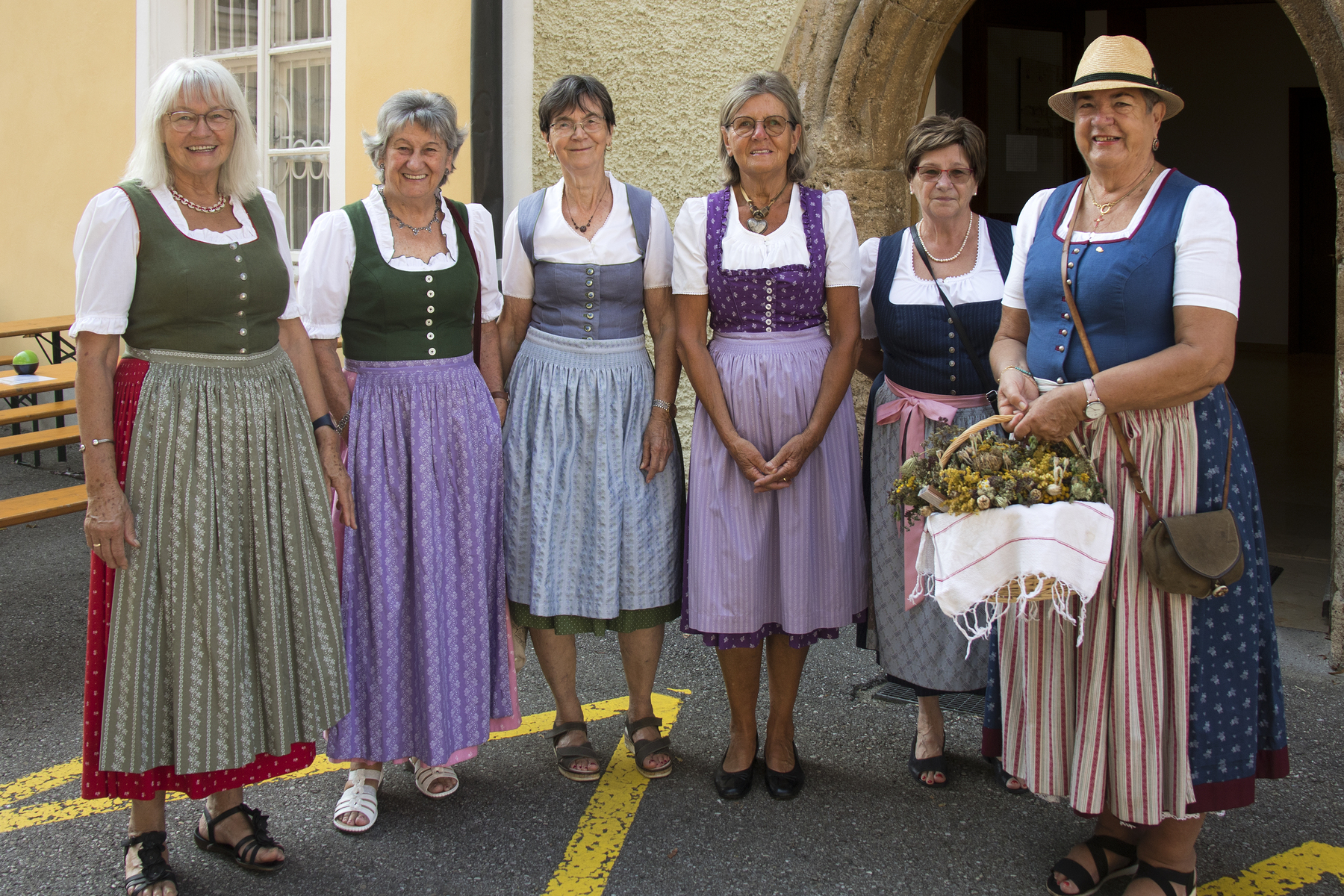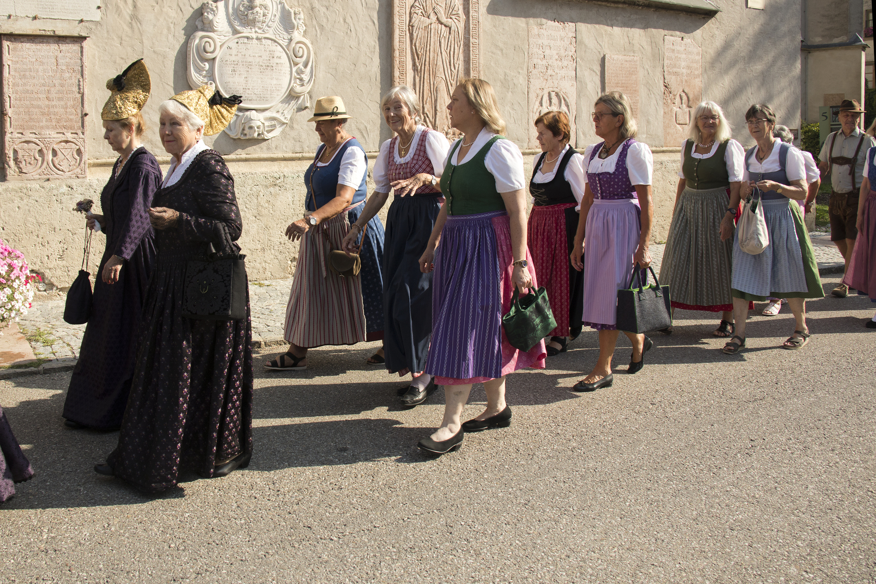 Viele Trachtler und Goldhauben-Frauen von "drent und herent", dh von beiden Seiten des Inns, waren zu dieser Festmesse, die Monsignore Stefan Hofer mit der Gemeinde feierte, gekommen. Frau Christa Gratzl, Obfrau der Goldhauben von Haselbach, in deren Händen auch heuer wieder die Organisation des Festes lag, begrüßte alle Mitfeiernden und lud ein zum besonderen Gedenken an die Begründerin des "Tags der Tracht", Frau Hermine Oberhuemer ("Guggi"), die erst vor kurzem verstorben war. Ihr mit Blumen geschmückter "Stammplatz" in der ersten Reihe sollte als äußeres Zeichen an sie und ihre vielen Verdienste erinnern.