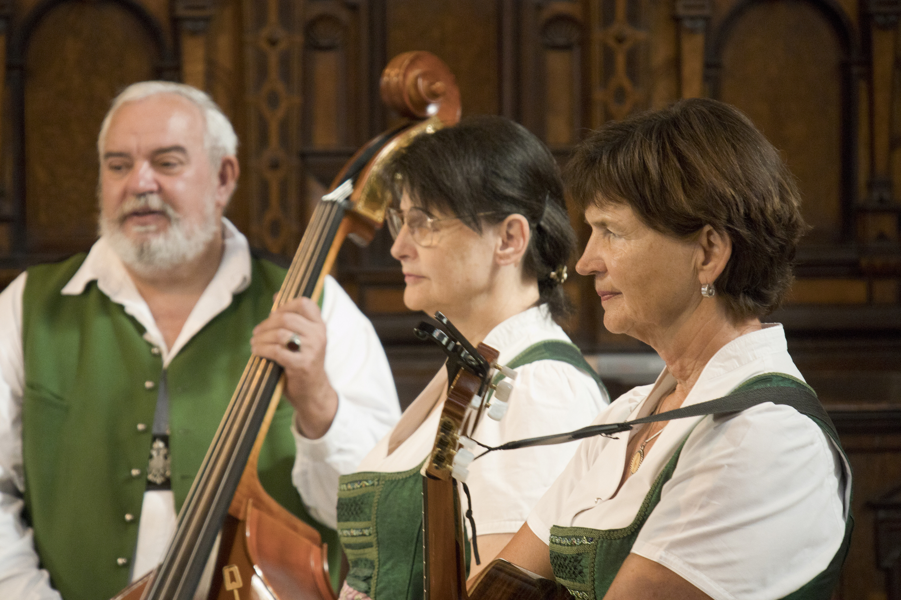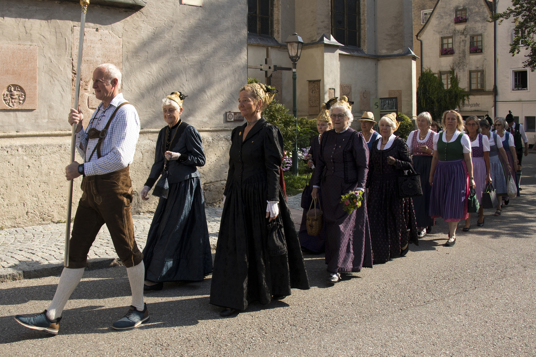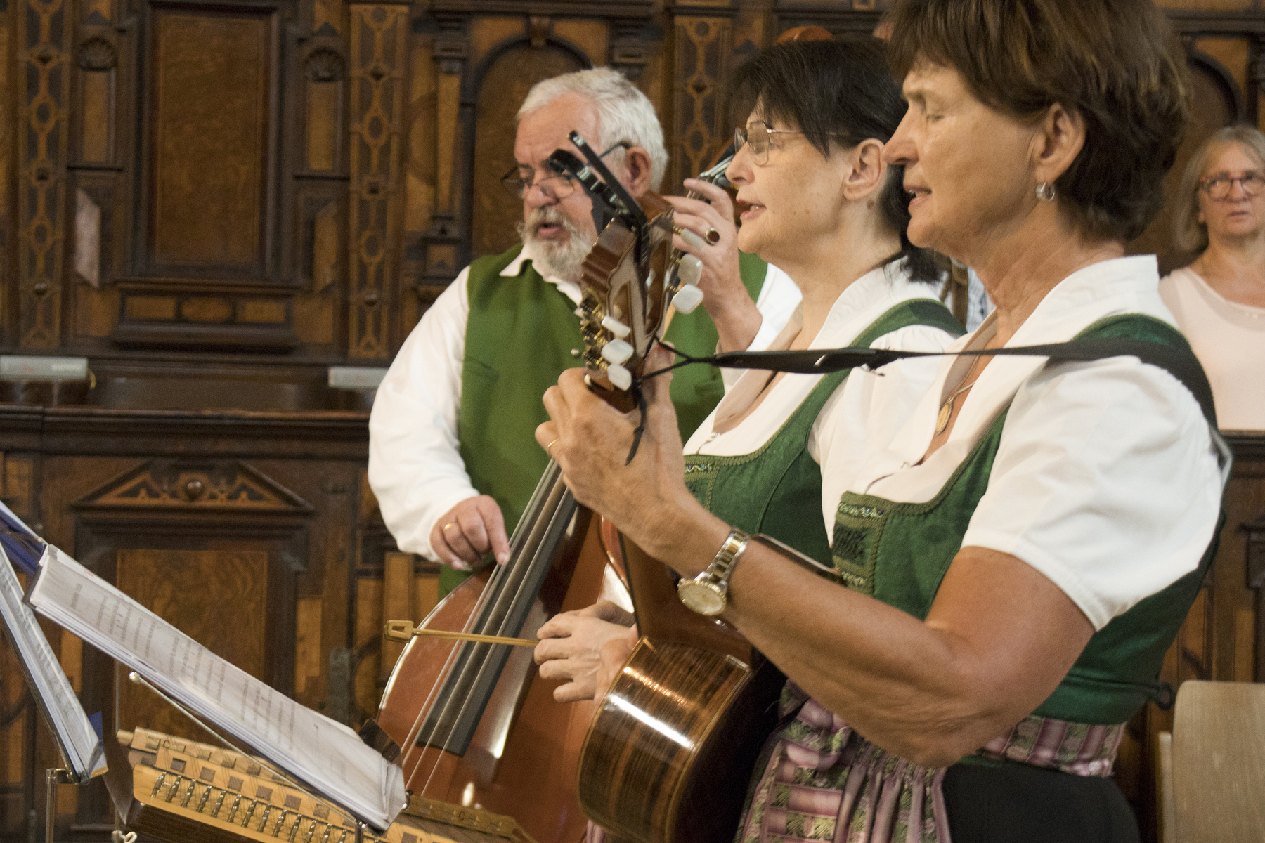 Viele Trachtler und Goldhauben-Frauen von "drent und herent", dh von beiden Seiten des Inns, waren zu dieser Festmesse, die Monsignore Stefan Hofer mit der Gemeinde feierte, gekommen. Frau Christa Gratzl, Obfrau der Goldhauben von Haselbach, in deren Händen auch heuer wieder die Organisation des Festes lag, begrüßte alle Mitfeiernden und lud ein zum besonderen Gedenken an die Begründerin des "Tags der Tracht", Frau Hermine Oberhuemer ("Guggi"), die erst vor kurzem verstorben war. Ihr mit Blumen geschmückter "Stammplatz" in der ersten Reihe sollte als äußeres Zeichen an sie und ihre vielen Verdienste erinnern.