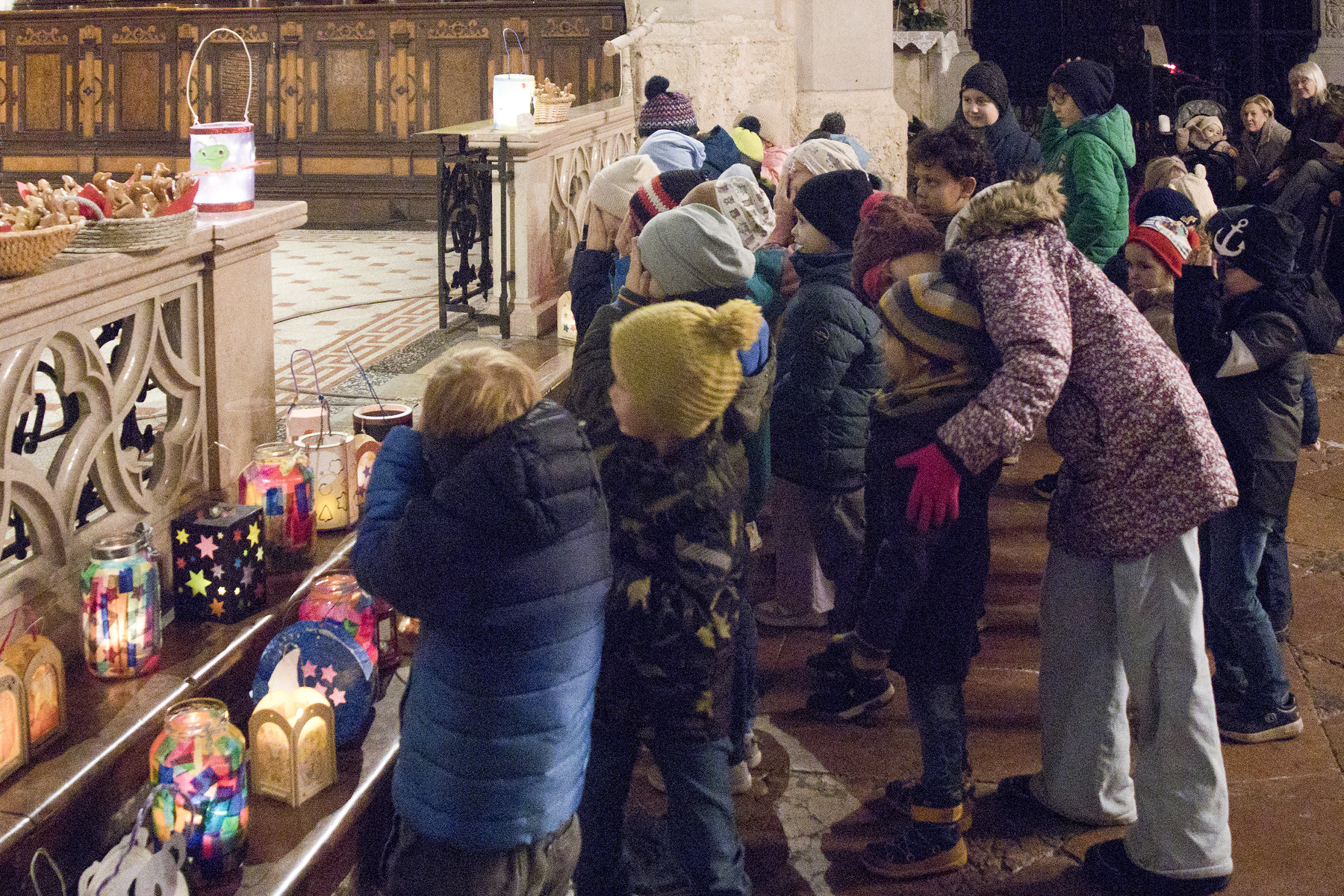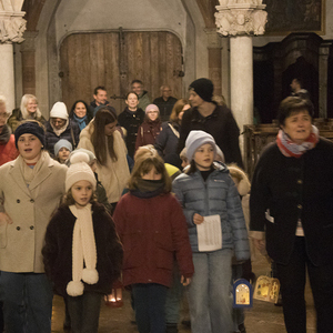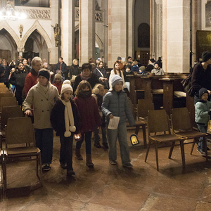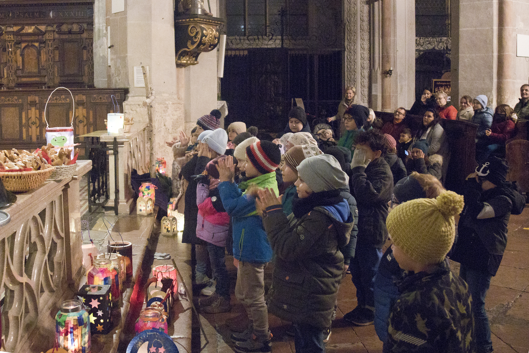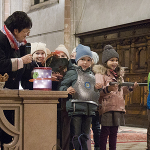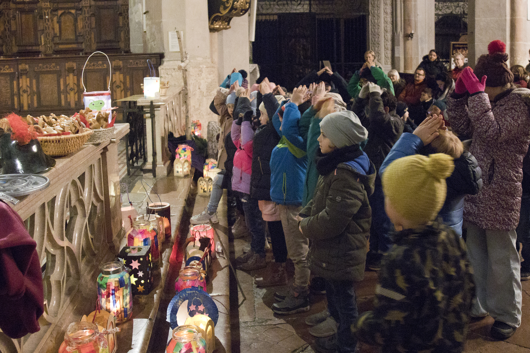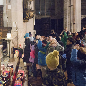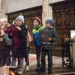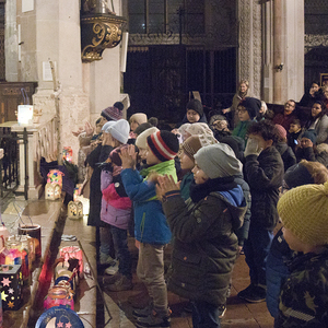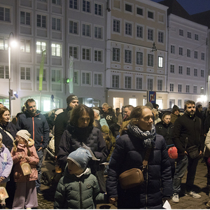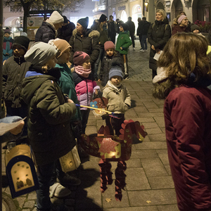 Am Festtag des Hl. Martin versammelten sich bei Einbruch der Dunkelheit viele Kinder mit ihren bunten Laternen zum Laternenumzug. Mit musikalischer Begleitung durch Bläser der Stadtkapelle Braunau zogen die Laternenträger mit ihren Begleitpersonen vom Palmpark durch das Rathaus über den Stadtplatz zur Stadtpfarrkirche, wo alle gemeinsam mit Kurat Josef Pollhammer eine Andacht feierten. Matthias Kritzinger von der Stadtkapelle begleitete die Lieder auf dem Klavier; begeistert beteiligten sich die Kinder an der Mitmach-Geschichte über den Heiligen Martin, die Inge Fink den Kindern erzählte. "Süße" Gänse aus Lebkuchenteig, die Anni Hauser und Gertraud Plank gebacken hatten und die an den Kirchentüren verteilt wurden, konnten alle zum Teilen mit nach Hause nehmen.