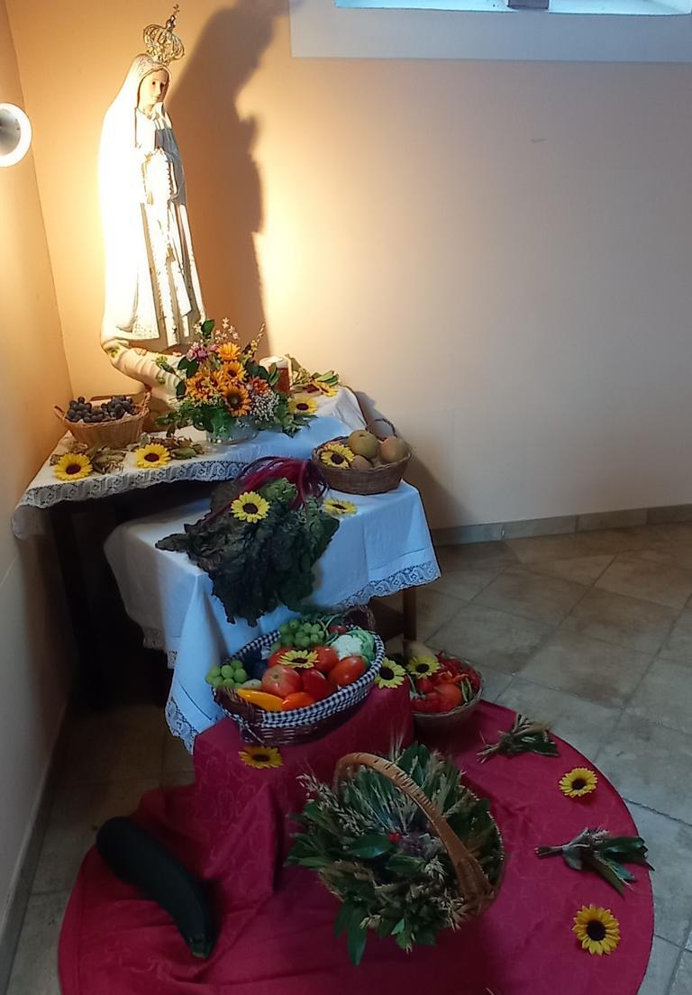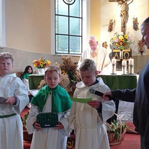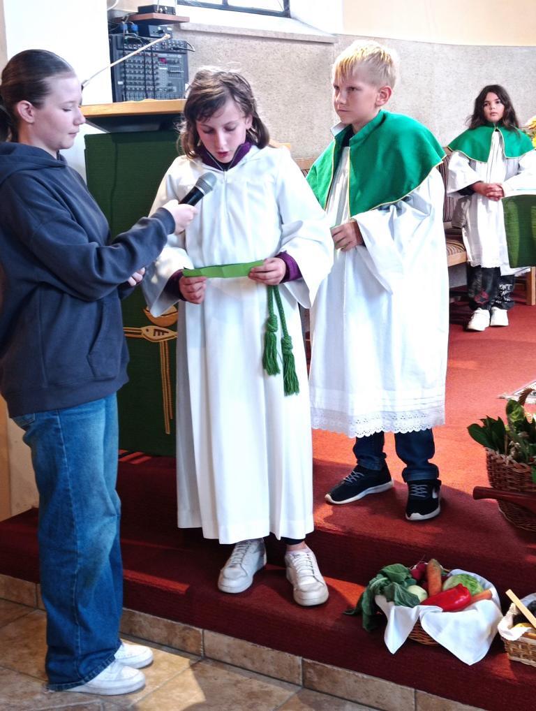 Wetterbedingt wurde die Erntedankkrone über die verkürzte Route in die Kirche getragen. Kinder brachten die Erntedankgaben zum Altar und sprachen die Dankesgebete. Im Anschluß an den Festgottesdienst wurden die Besucher n den Pfarrsaal geladen.