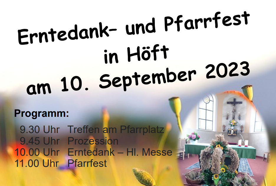10. September 2023 - Erntedank- & Pfarrfest in Höft Wir laden euch alle recht herzlich zu unserem Erntedank- & Pfarrfest in Höft ein. mehr: 10. September 2023 - Erntedank- & Pfarrfest in Höft